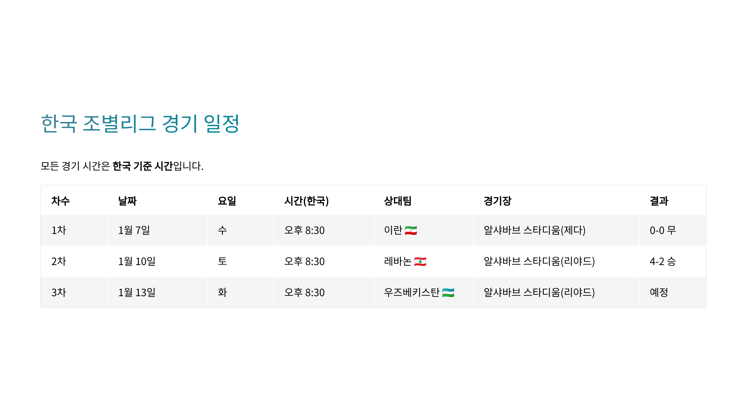 | 3차 | 1월 13일 | 화 | 오후 8:30 | 우즈베키스탄 🇺🇿 | 알샤바브 스타디움(리야드) | 예정 |