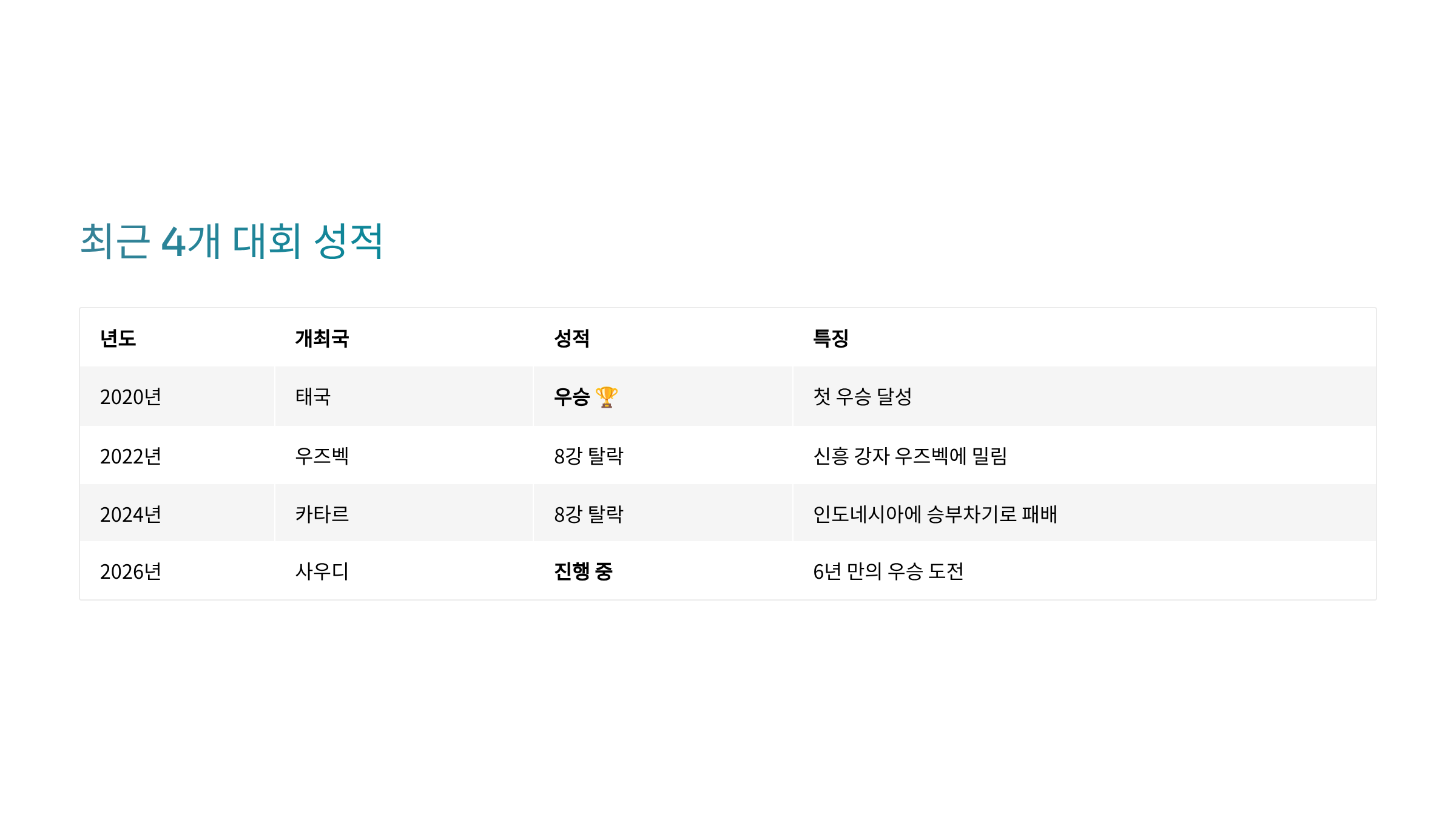 | 2026년 | 사우디 | 진행 중 | 6년 만의 우승 도전 |