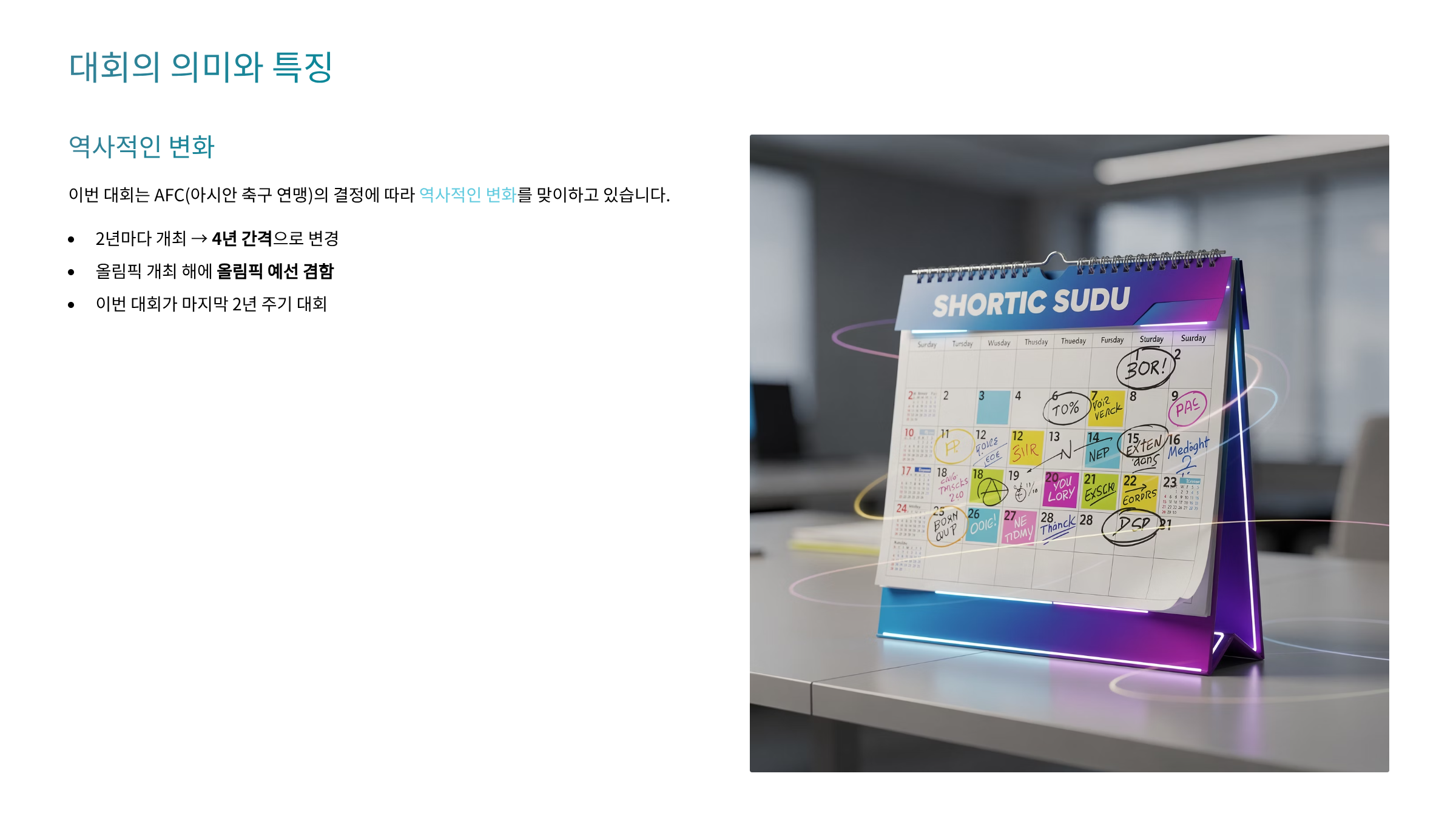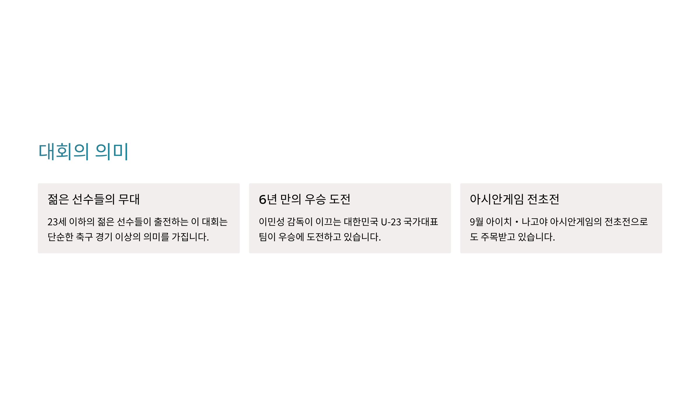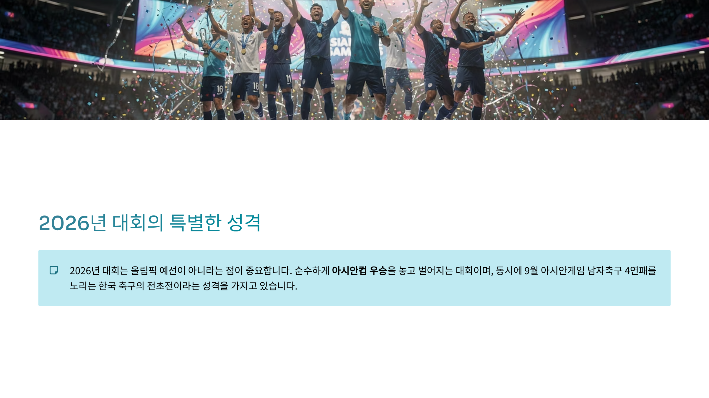 따라서 2026년 대회는 올림픽 예선이 아니라는 점이 중요합니다. 순수하게 아시안컵 우승을 놓고 벌어지는 대회이며, 동시에 9월 아시안게임 남자축구 4연패를 노리는 한국 축구의 전초전이라는 성격을 가지고 있습니다.