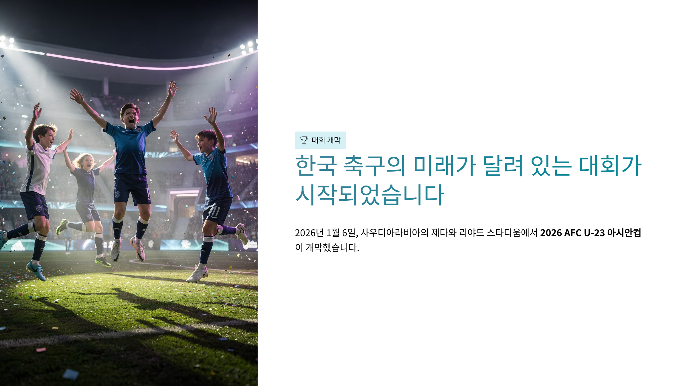 2026년 1월 6일, 사우디아라비아의 제다와 리야드 스타디움에서 2026 AFC U-23 아시안컵이 개막했습니다.