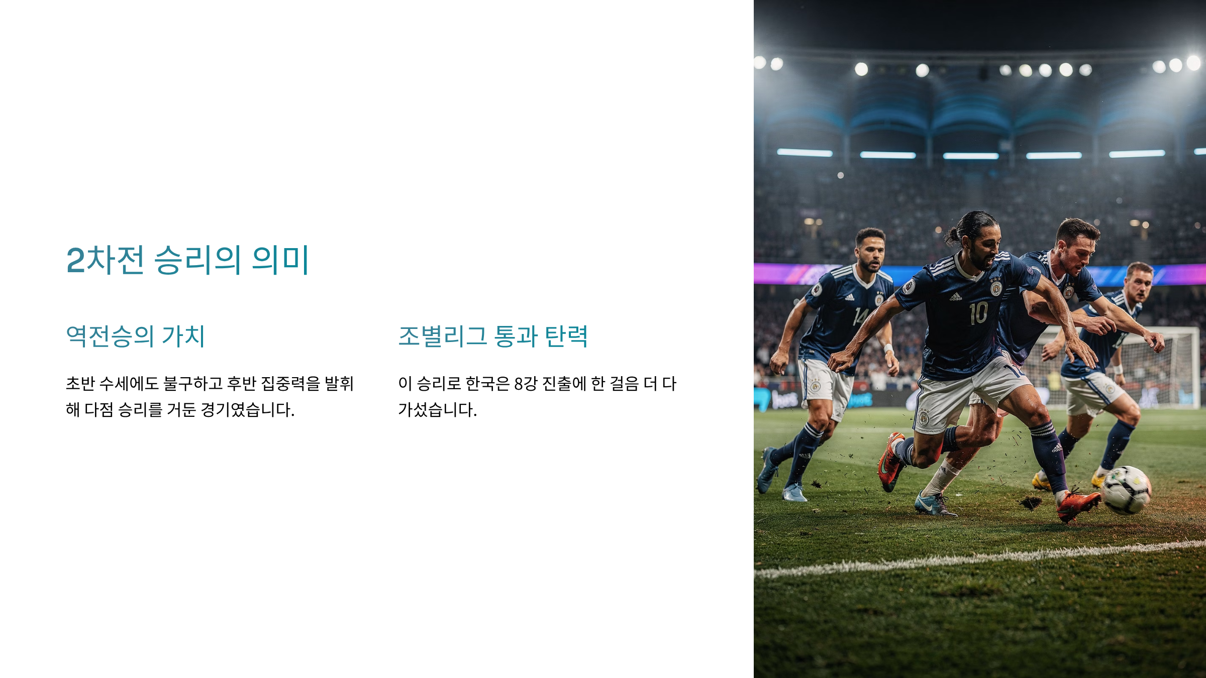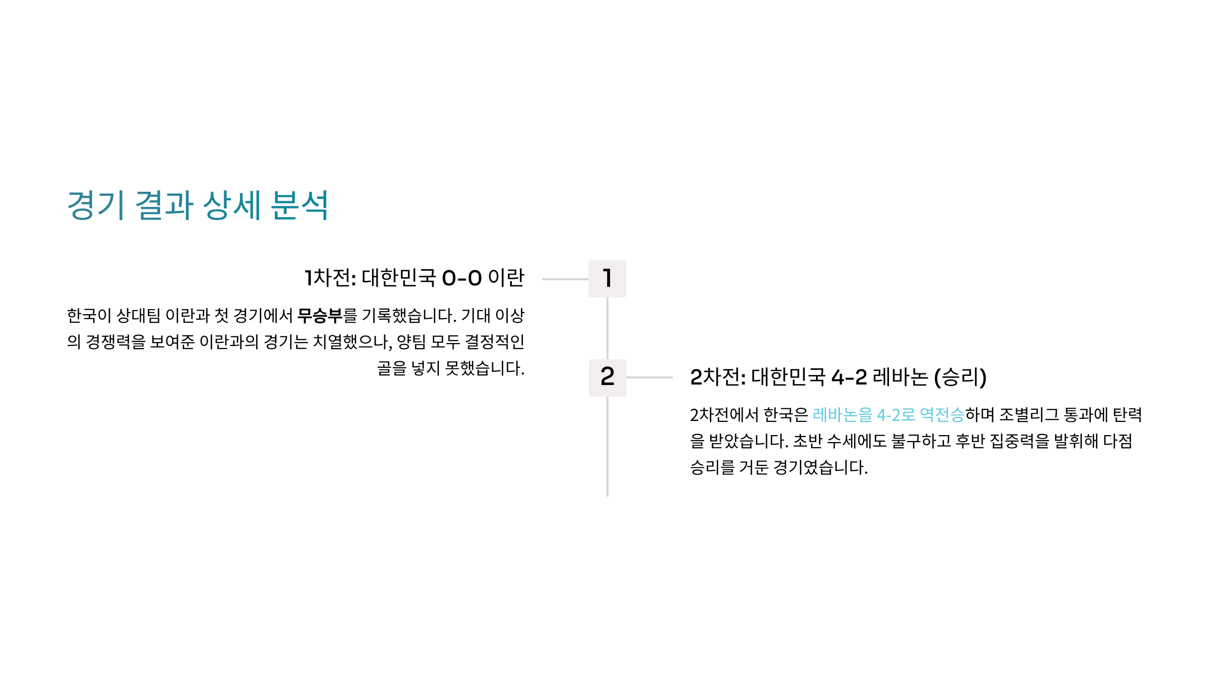 2차전에서 한국은 레바논을 4-2로 역전승하며 조별리그 통과에 탄력을 받았습니다. 초반 수세에도 불구하고 후반 집중력을 발휘해 다점 승리를 거둔 경기였습니다.