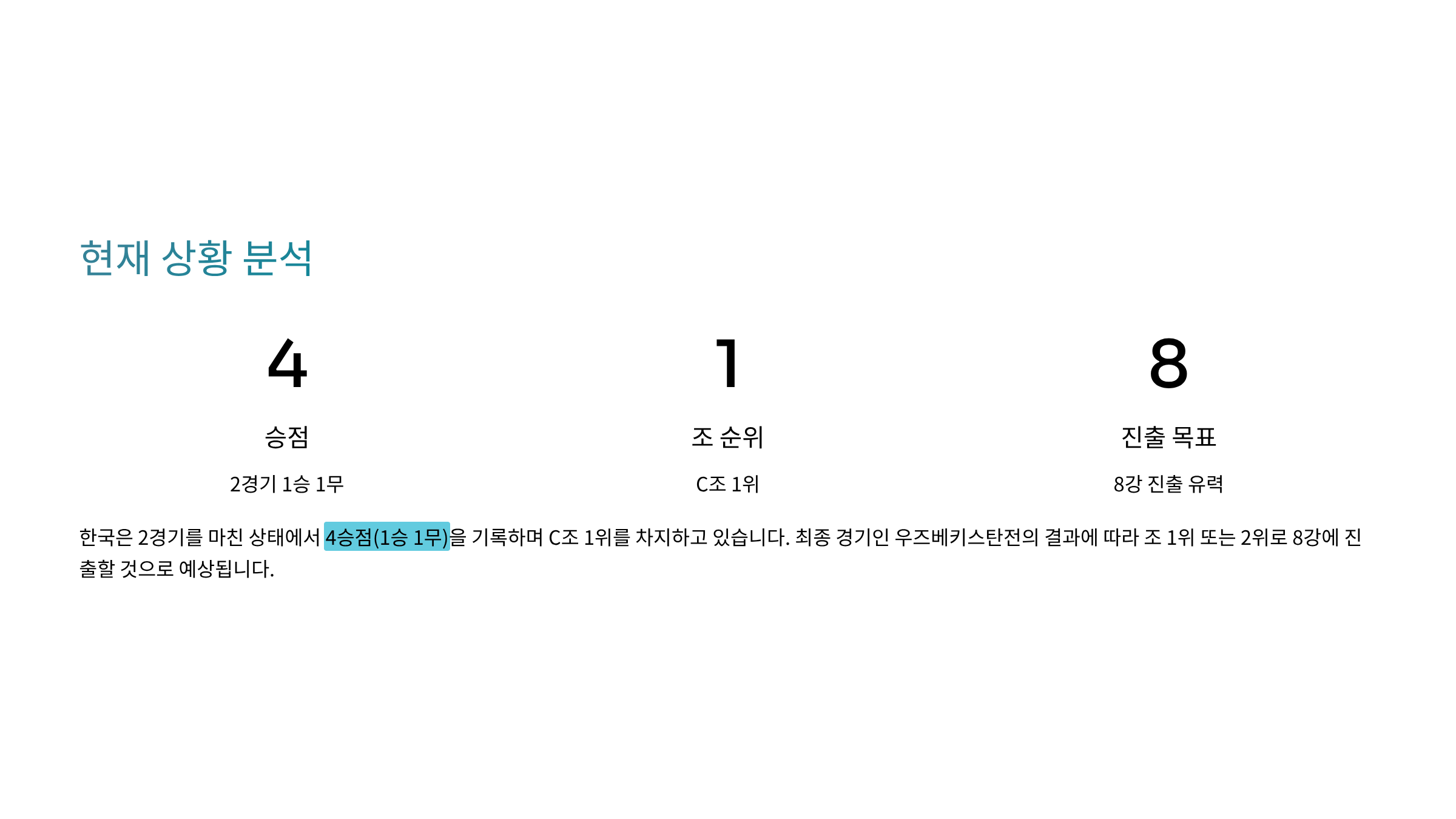 A. 현재 4승점으로 조 1~2위를 다투고 있어 8강 진출 가능성이 높습니다. 3차전 우즈베키스탄과의 경기가 매우 중요합니다.