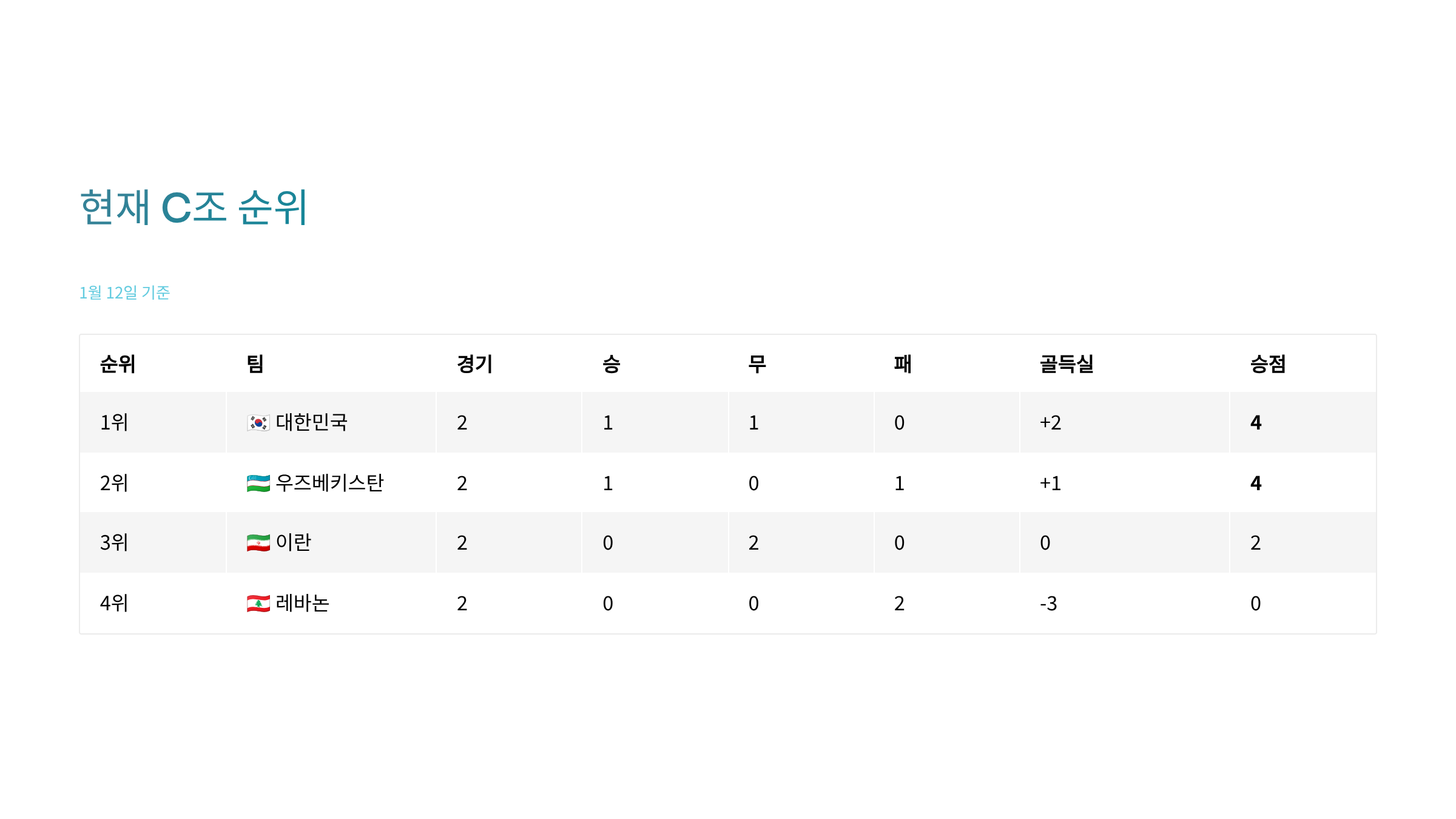 한국은 2경기를 마친 상태에서 **4승점(1승 1무)**을 기록하며 C조 1위를 차지하고 있습니다. 최종 경기인 우즈베키스탄전의 결과에 따라 조 1위 또는 2위로 8강에 진출할 것으로 예상됩니다.