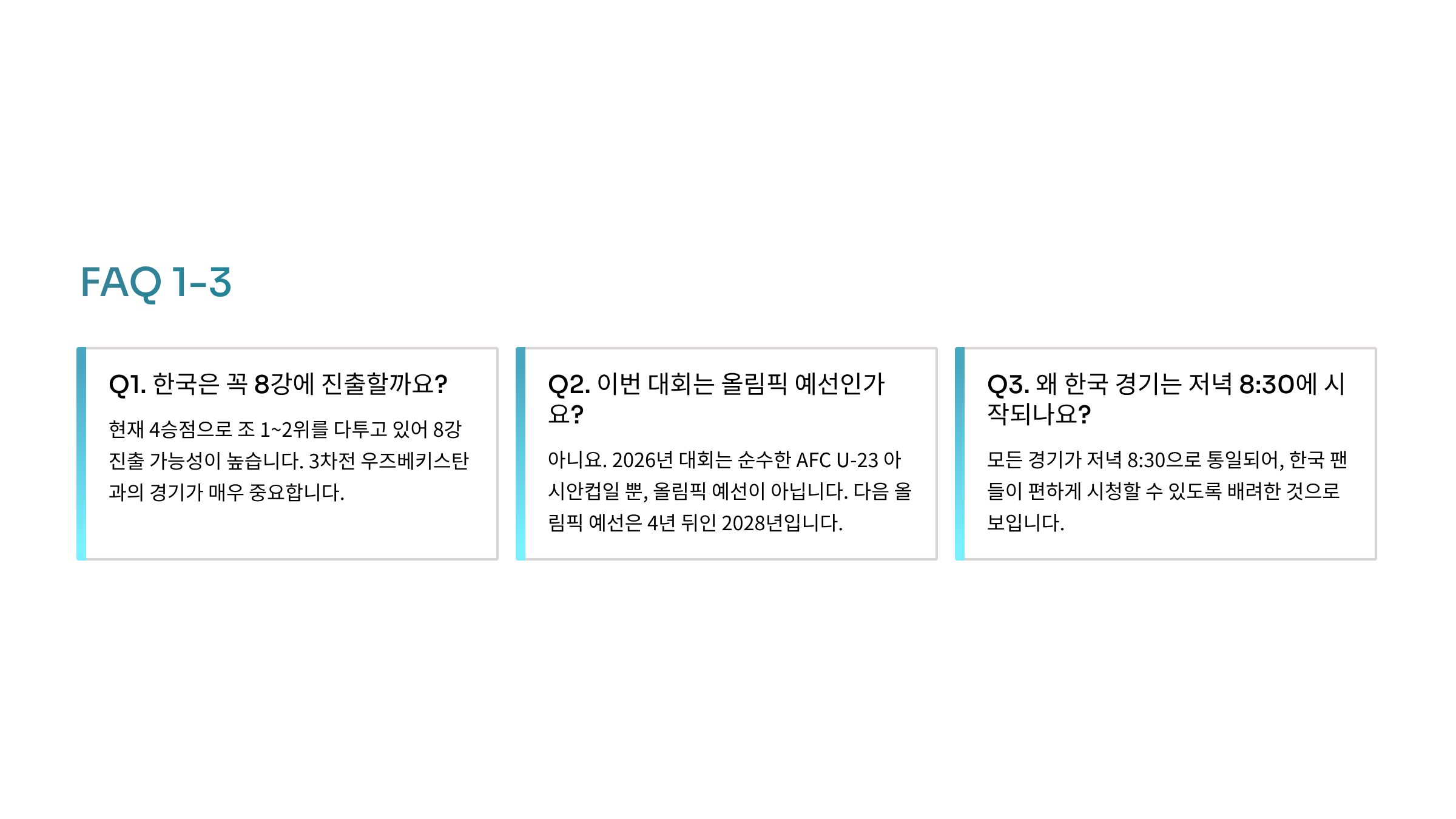A. 아니요. 2026년 대회는 순수한 AFC U-23 아시안컵일 뿐, 올림픽 예선이 아닙니다. 다음 올림픽 예선은 4년 뒤인 2028년입니다.