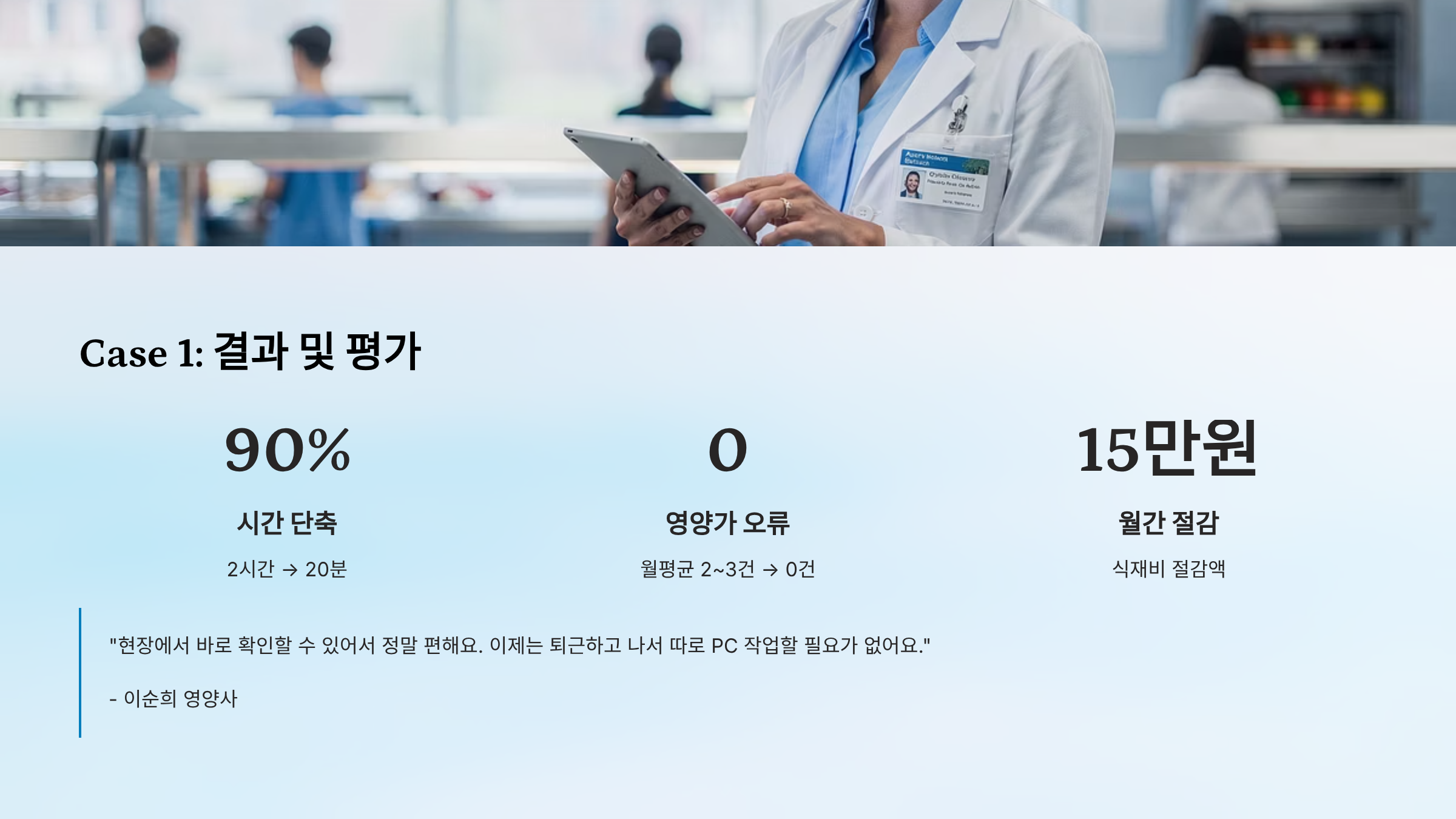 의견: "환자분들의 신뢰가 정말 높아졌어요. 정확한 영양 관리가 가능해졌거든요."
