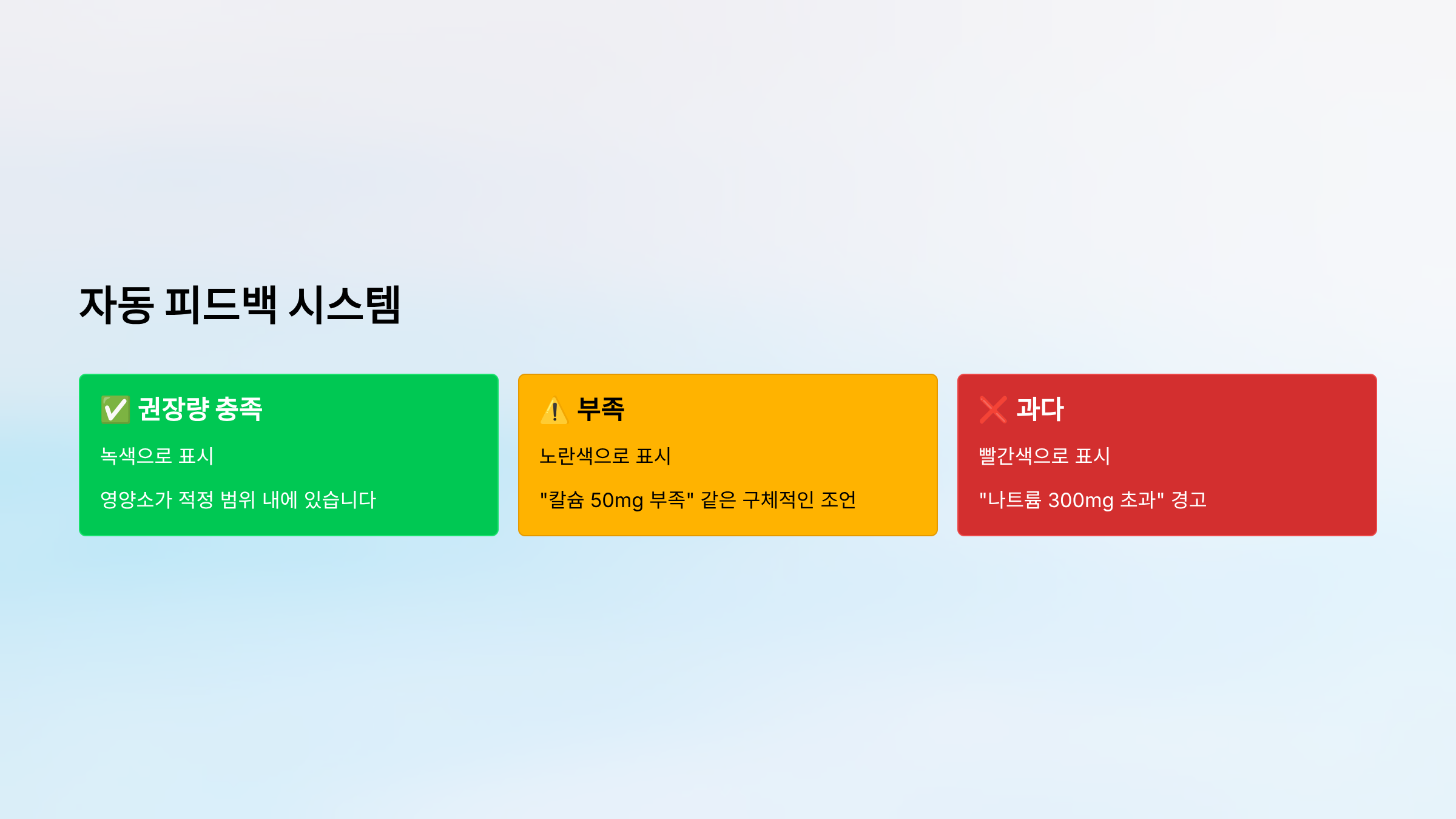 - ⚠️ 부족: 노란색으로 표시, "칼슘 50mg 부족" 같은 구체적인 조언