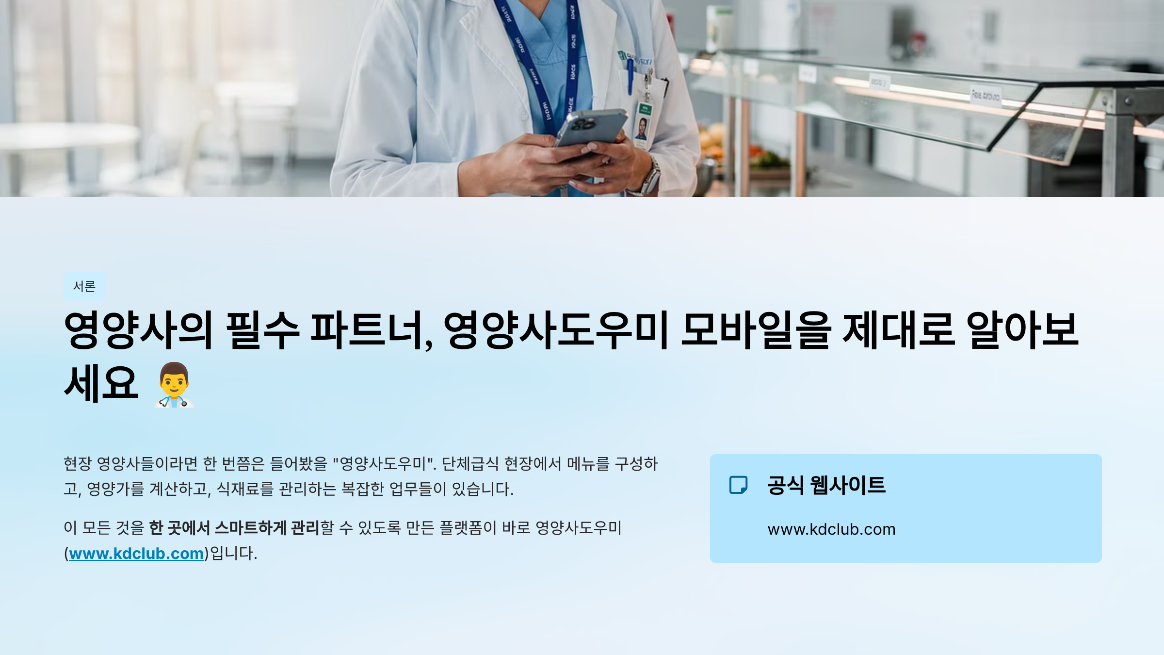 단체급식 현장에서 메뉴를 구성하고, 영양가를 계산하고, 식재료를 관리하는 복잡한 업무들이 있습니다. 이 모든 것을 한 곳에서 스마트하게 관리할 수 있도록 만든 플랫폼이 바로 영양사도우미(www.kdclub.com)입니다.