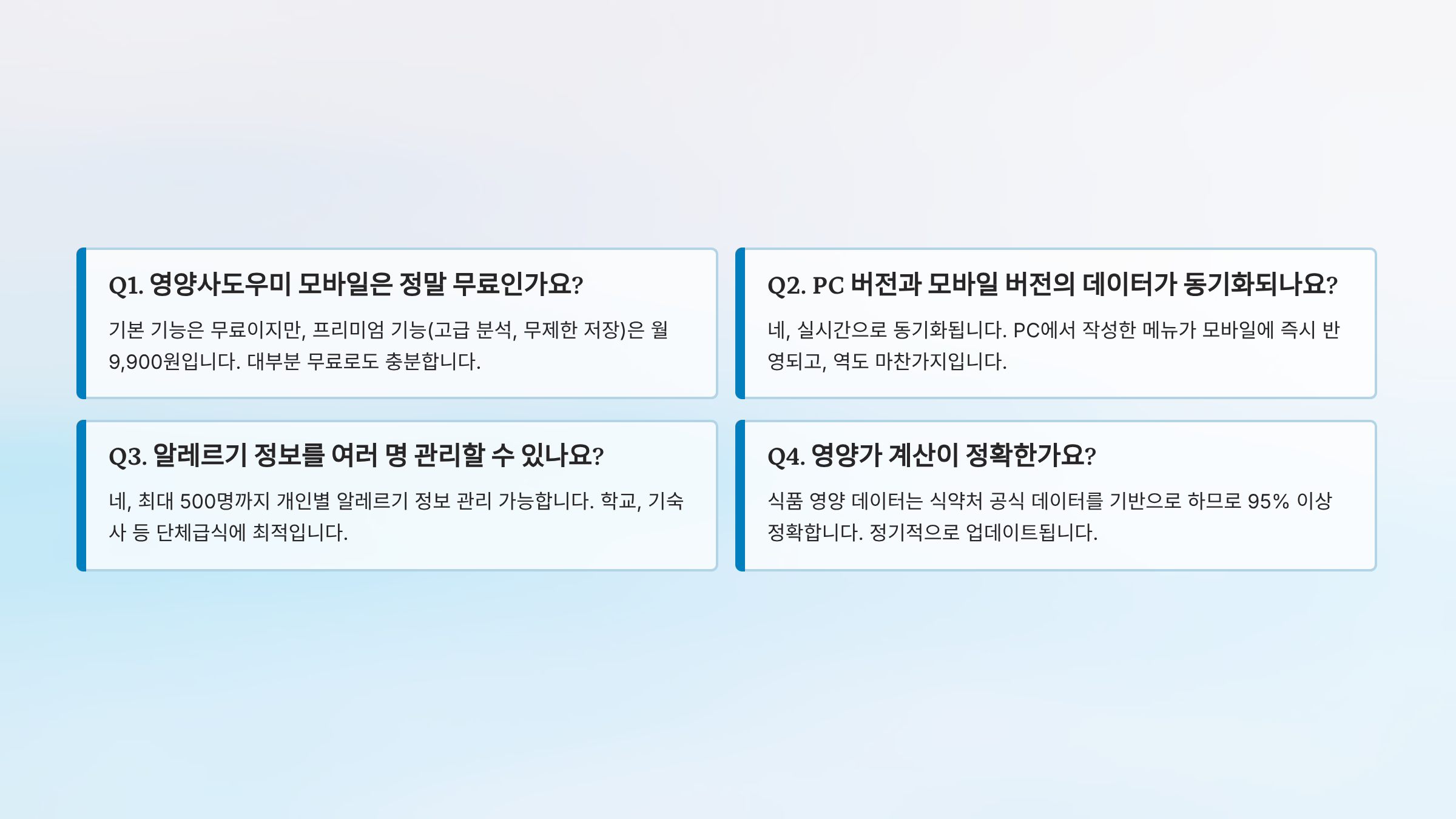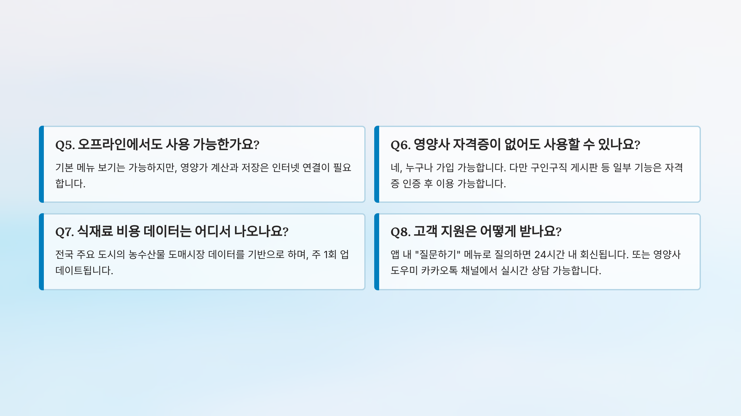A. 식품 영양 데이터는 식약처 공식 데이터를 기반으로 하므로 95% 이상 정확합니다. 정기적으로 업데이트됩니다.