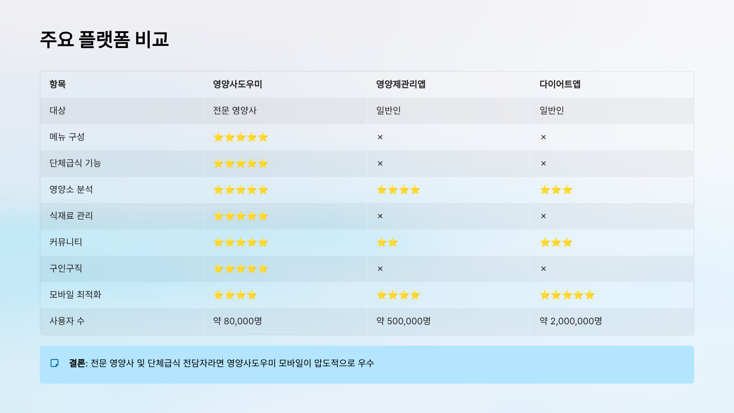 | 대상 | 전문 영양사 | 일반인 | 일반인 |
