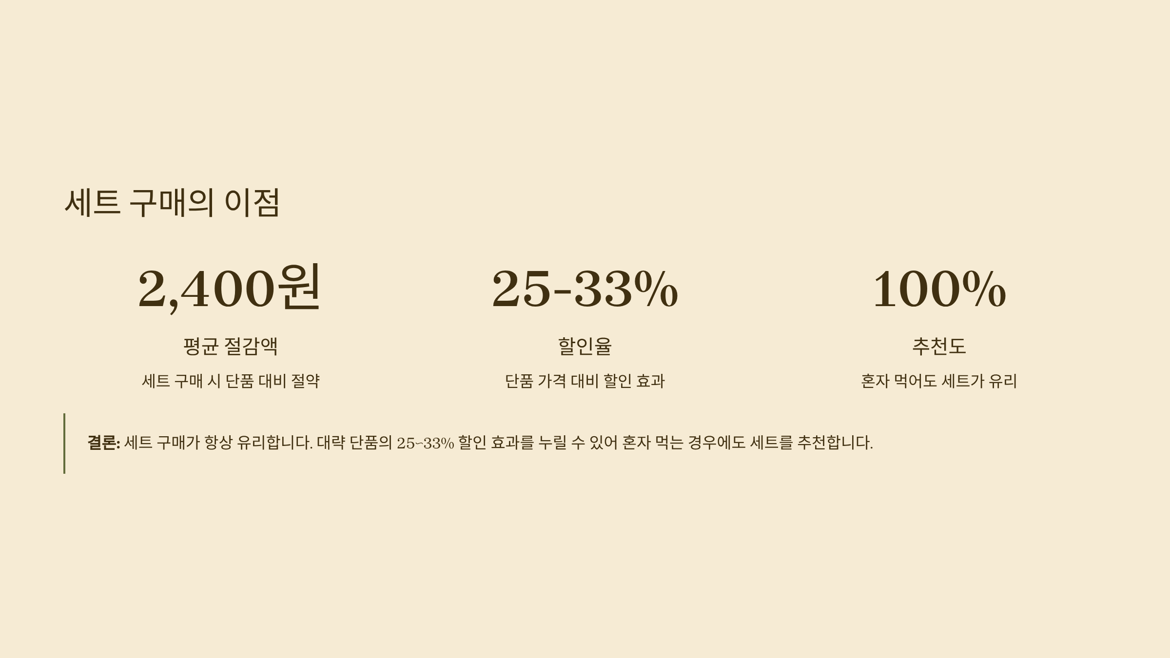 A. 세트가 확실히 저렴합니다. 단품의 25~33%를 절감할 수 있어 혼자 먹어도 세트를 추천합니다.