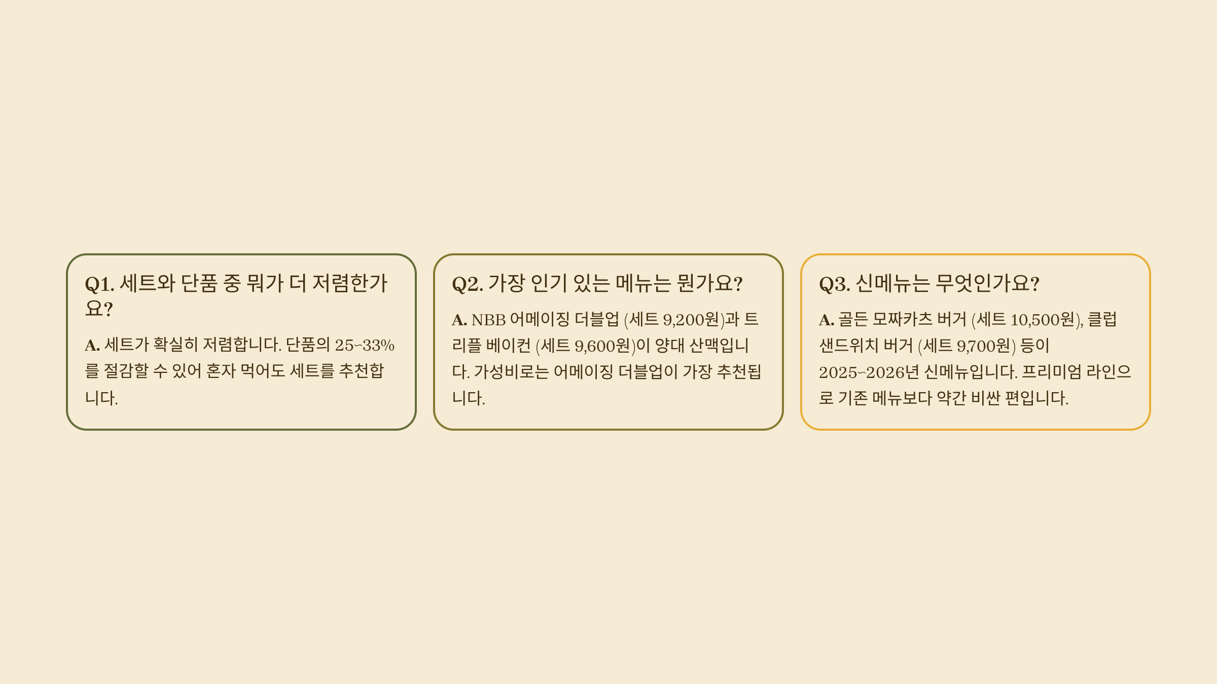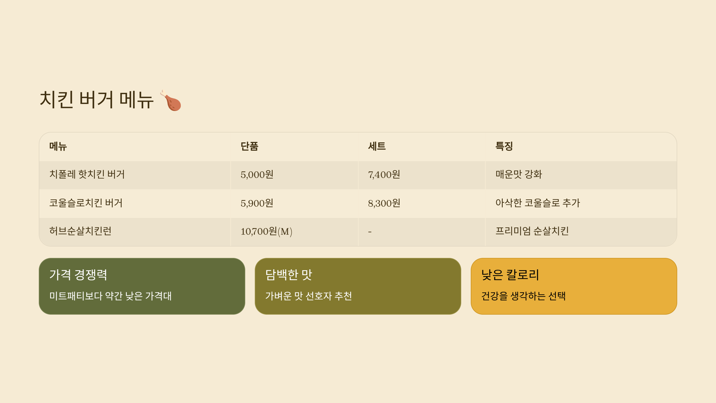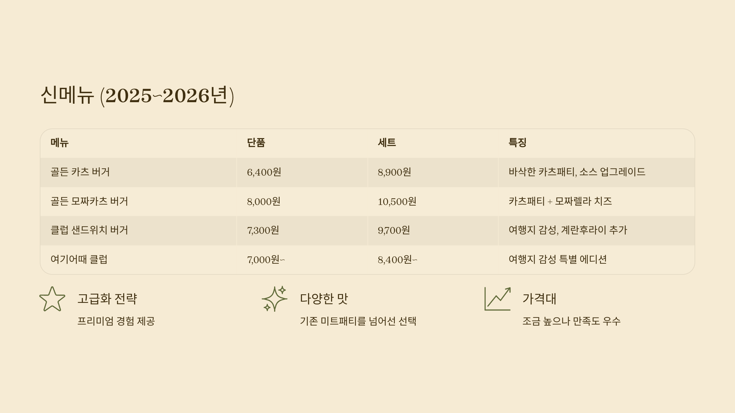 | 골든 카츠 버거 | 6,400원 | 8,900원 | 바삭한 카츠패티, 소스 업그레이드 |