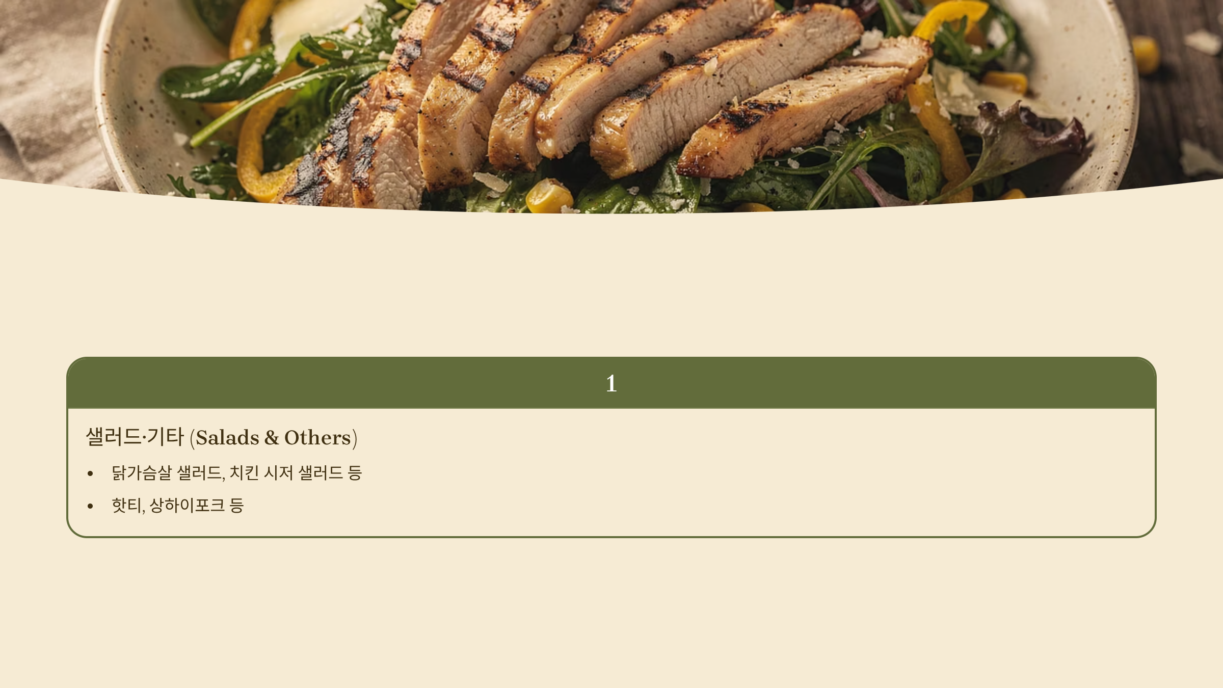 - 닭가슴살 샐러드, 치킨 시저 샐러드 등