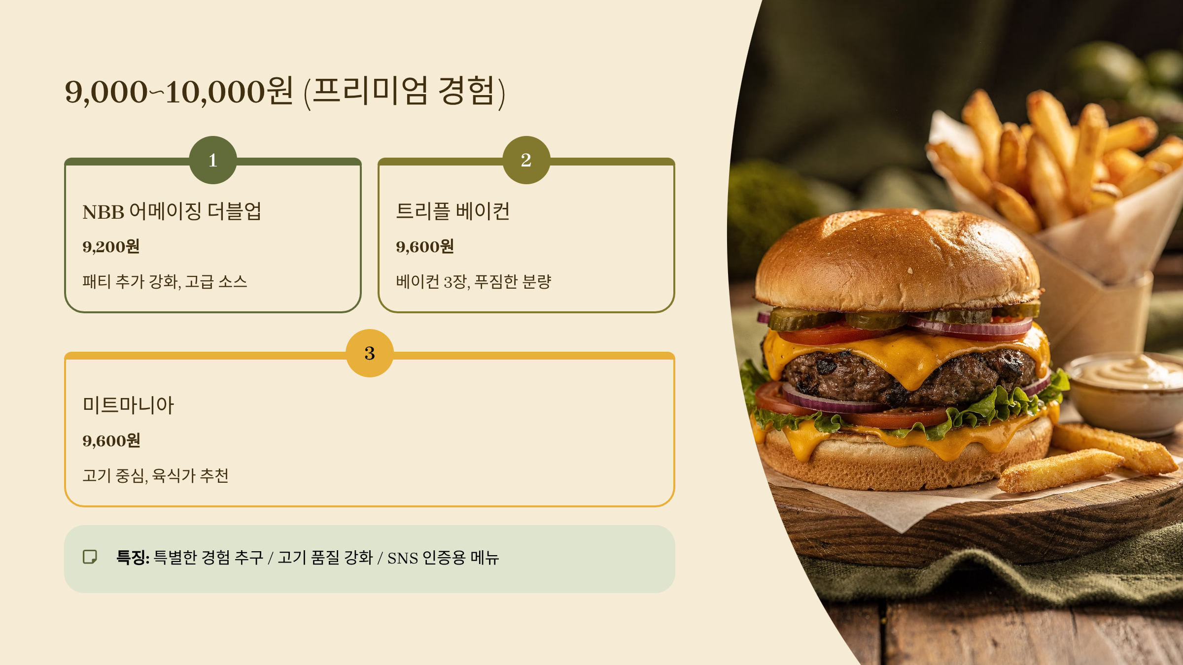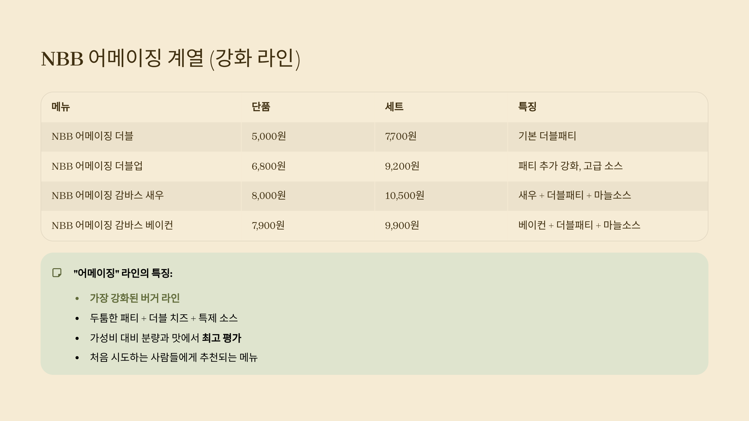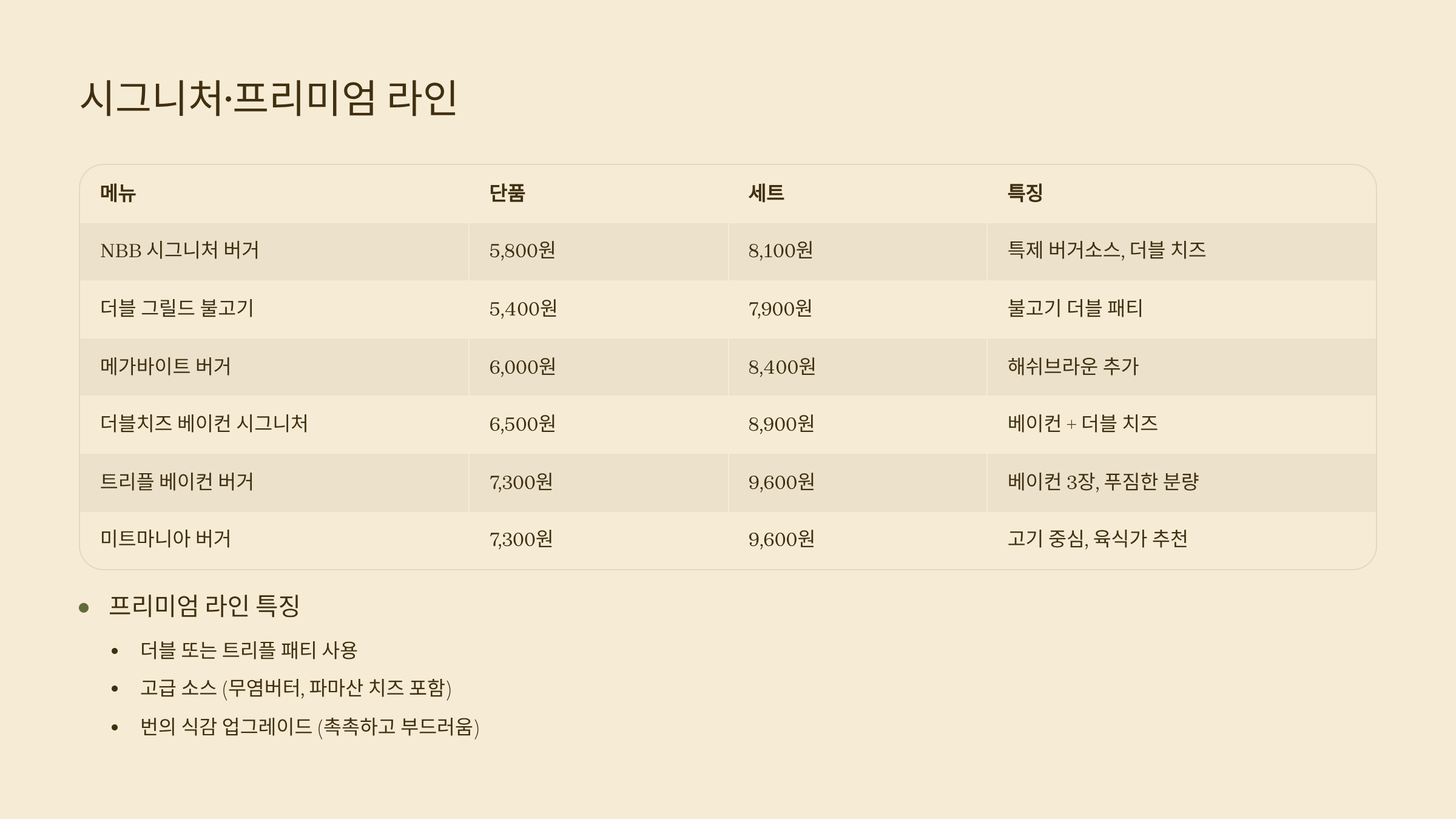 | NBB 시그니처 버거 | 5,800원 | 8,100원 | 특제 버거소스, 더블 치즈 |