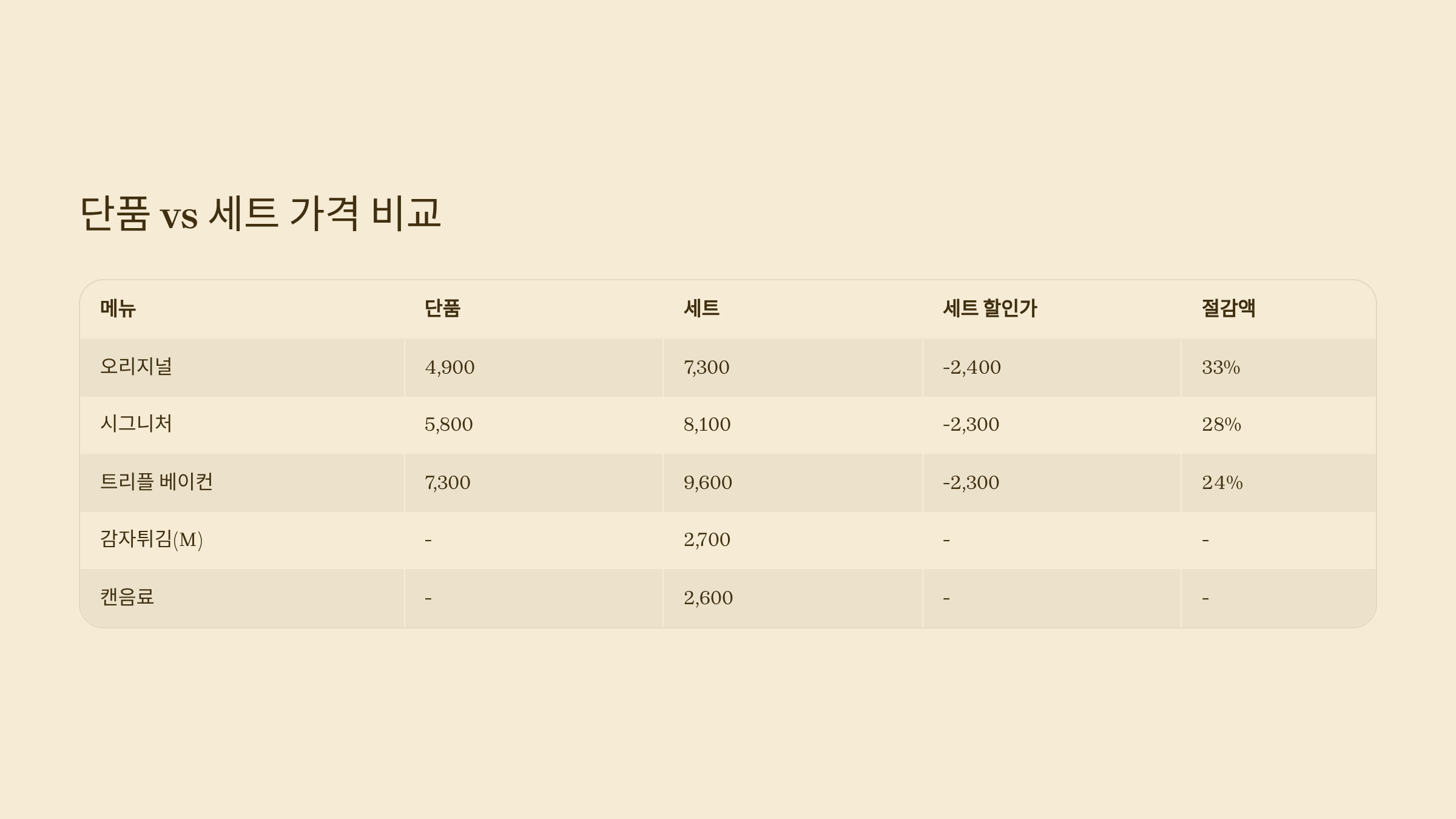 | 트리플 베이컨 버거 | 7,300원 | 9,600원 | 베이컨 3장, 푸짐한 분량 |