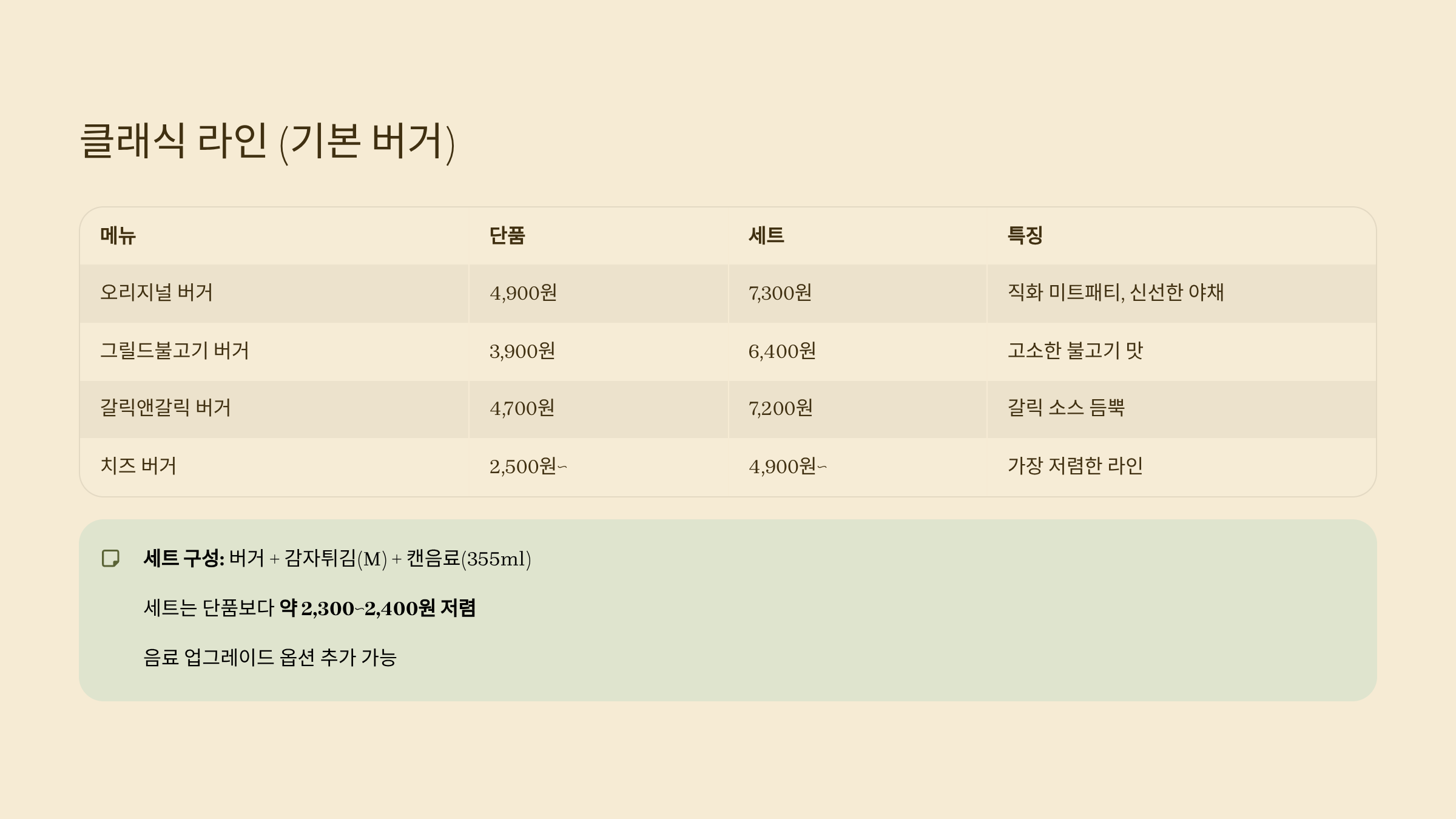 | 치즈 버거 | 2,500원~ | 4,900원~ | 가장 저렴한 라인 |