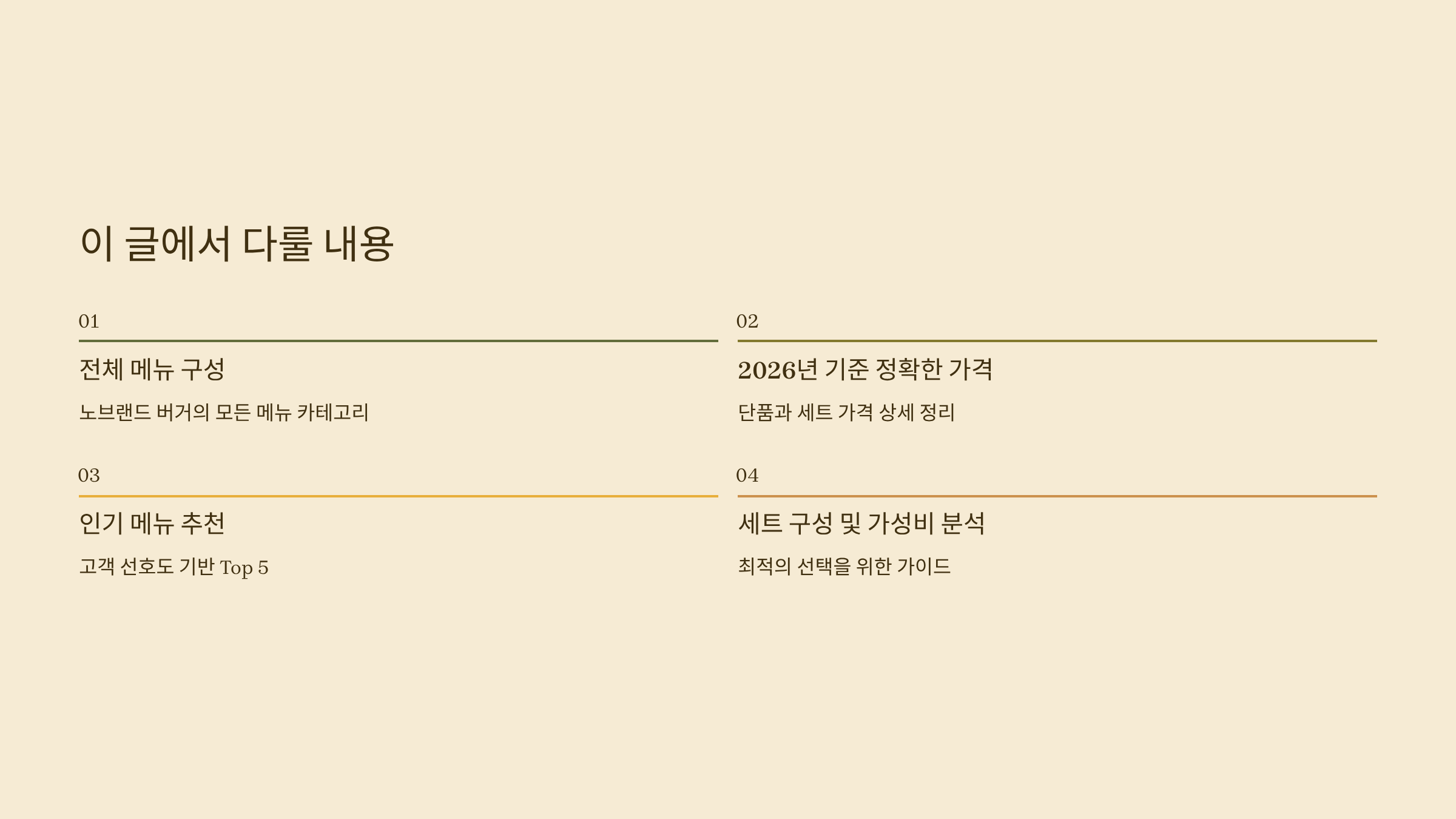 이 글에서는 노브랜드 버거의 전체 메뉴 구성, 2026년 기준 정확한 가격, 인기 메뉴 추천, 세트 구성을 상세히 정리해드리겠습니다.