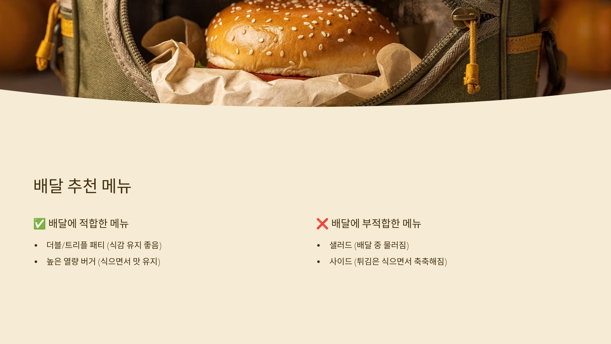 - ❌ 샐러드 (배달 중 물러짐)