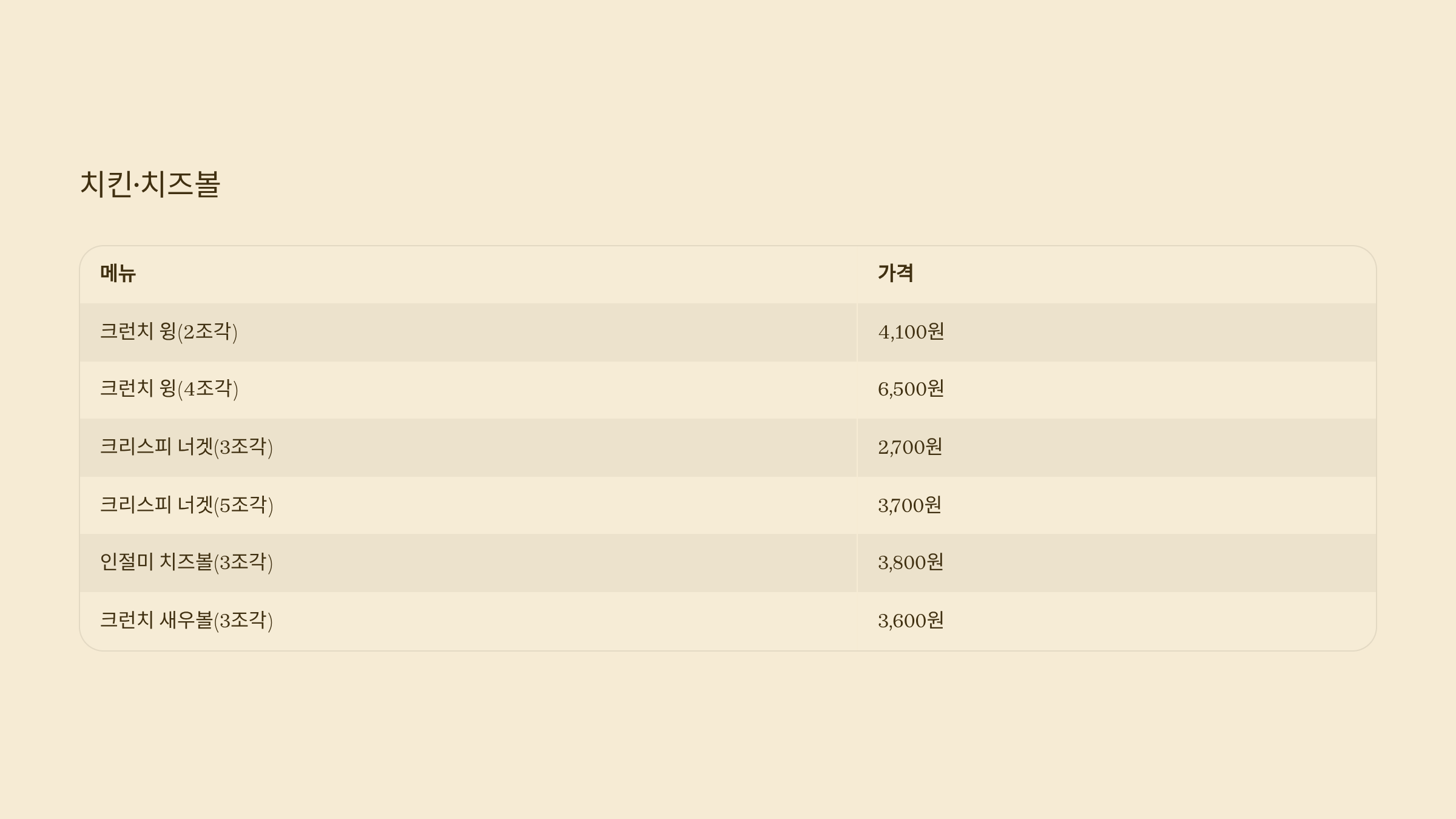 | 크런치 윙(2조각) | 4,100원 |