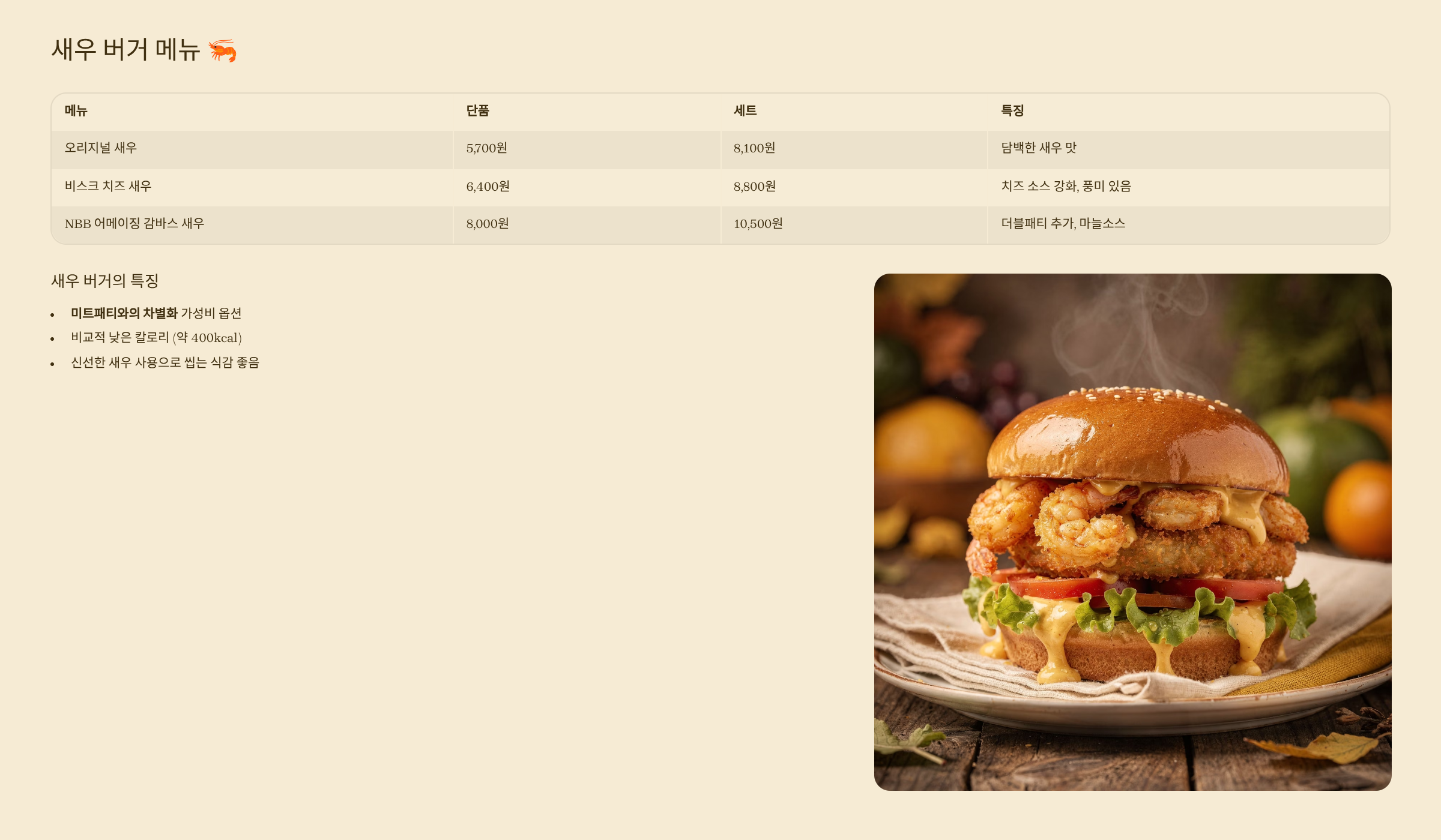 새우 버거의 특징: