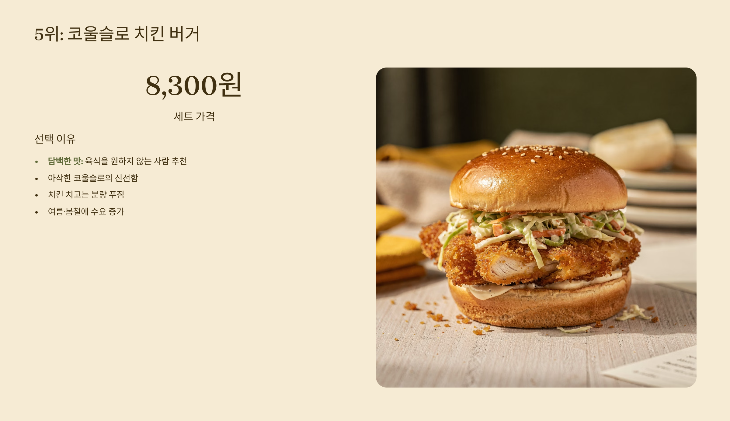 5위: 코울슬로 치킨 버거 (세트 8,300원)