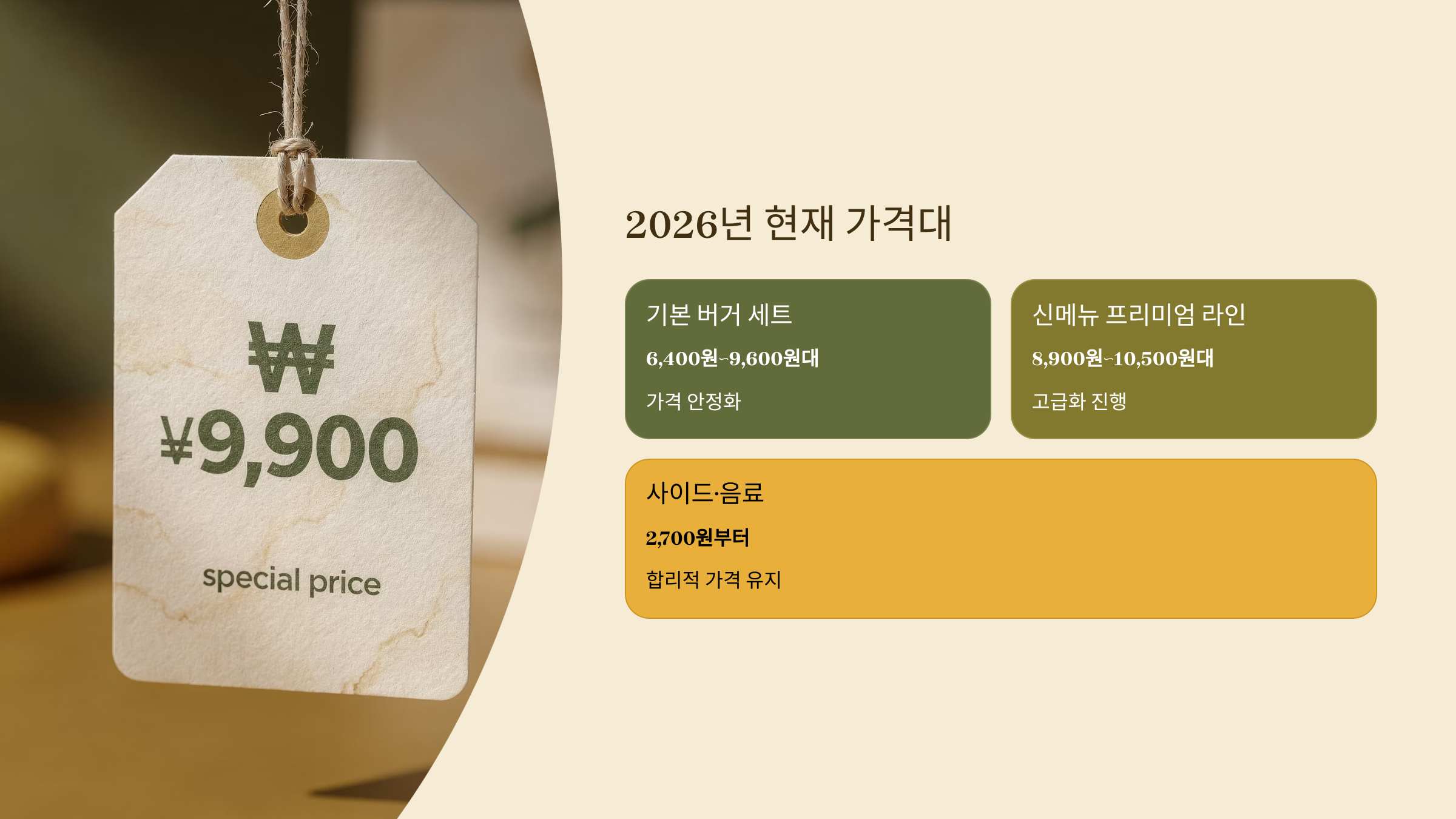 - 기본 버거 세트: 6,400원~9,600원대 (가격 안정화)