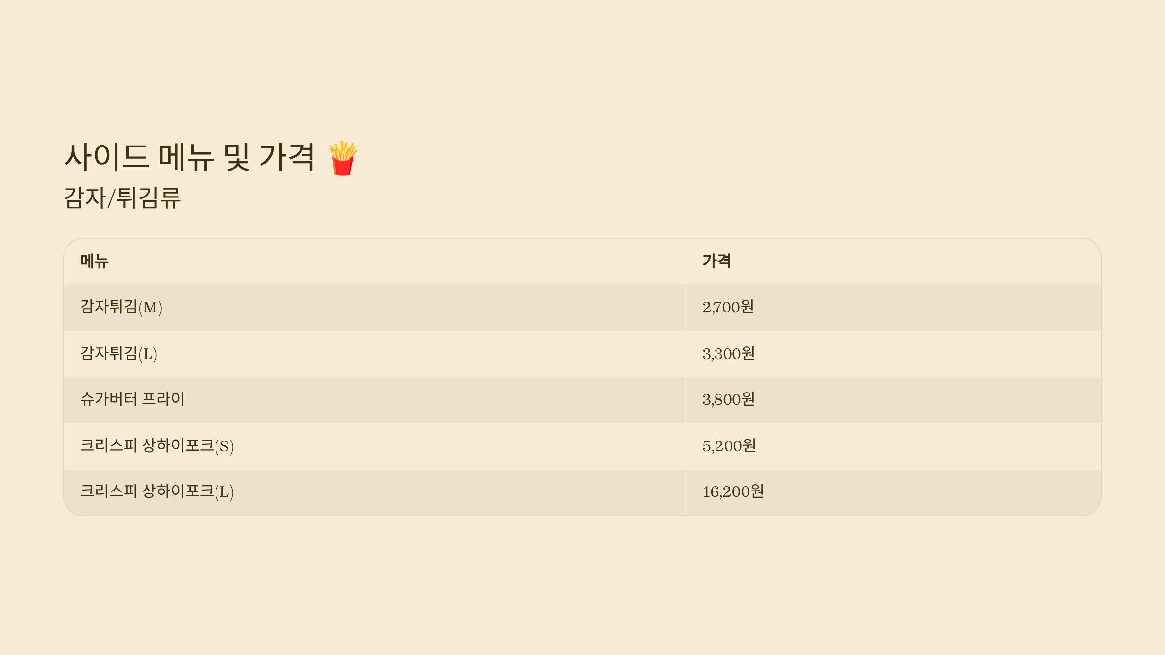 | 슈가버터 프라이 | 3,800원 |