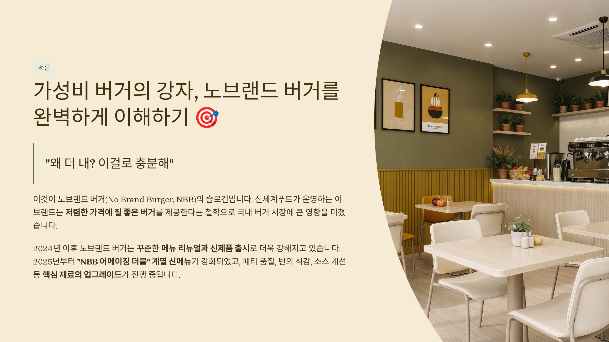 이것이 노브랜드 버거(No Brand Burger, NBB)의 슬로건입니다. 신세계푸드가 운영하는 이 브랜드는 저렴한 가격에 질 좋은 버거를 제공한다는 철학으로 국내 버거 시장에 큰 영향을 미쳤습니다.