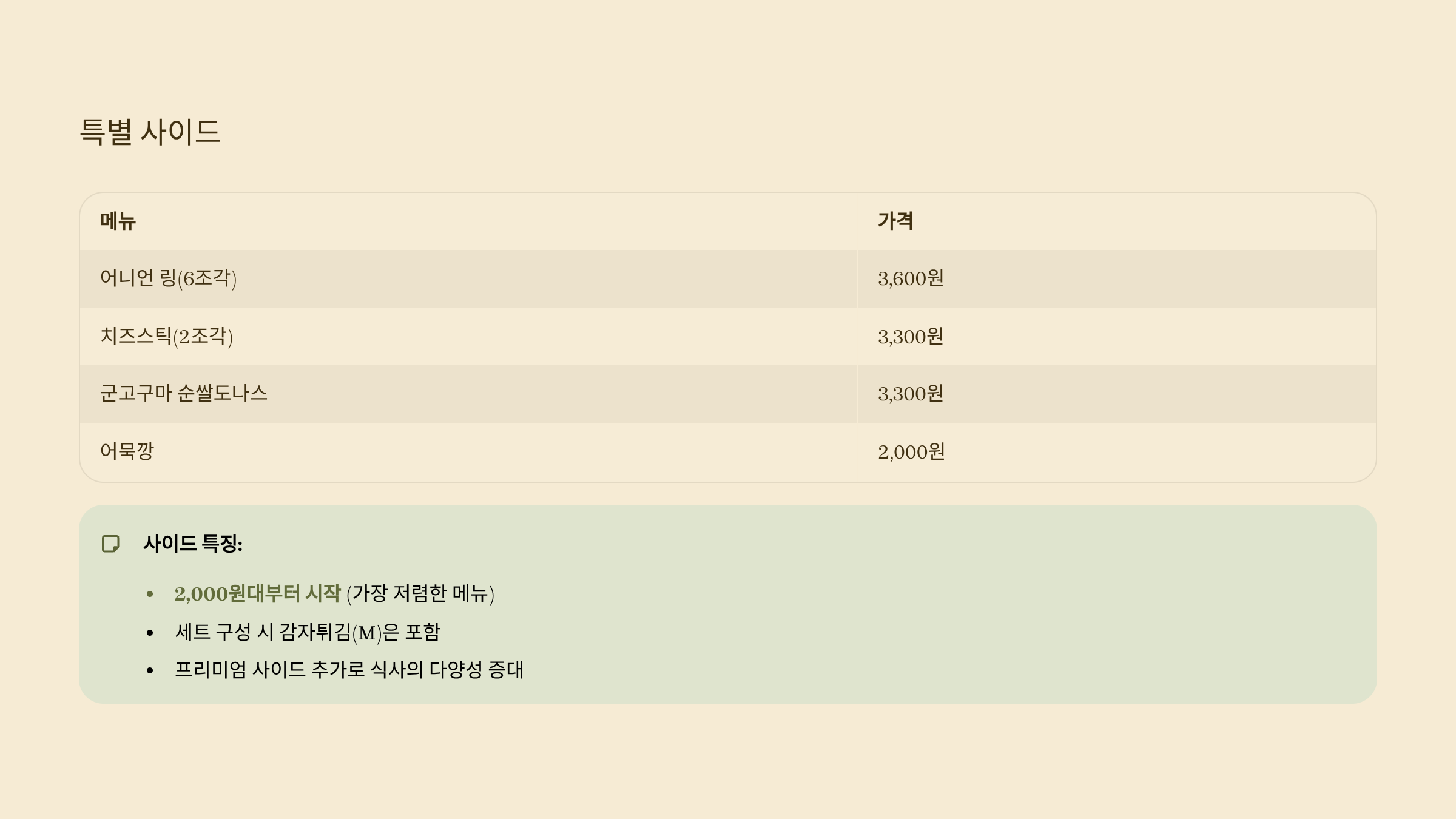 사이드 메뉴 및 가격 🍟