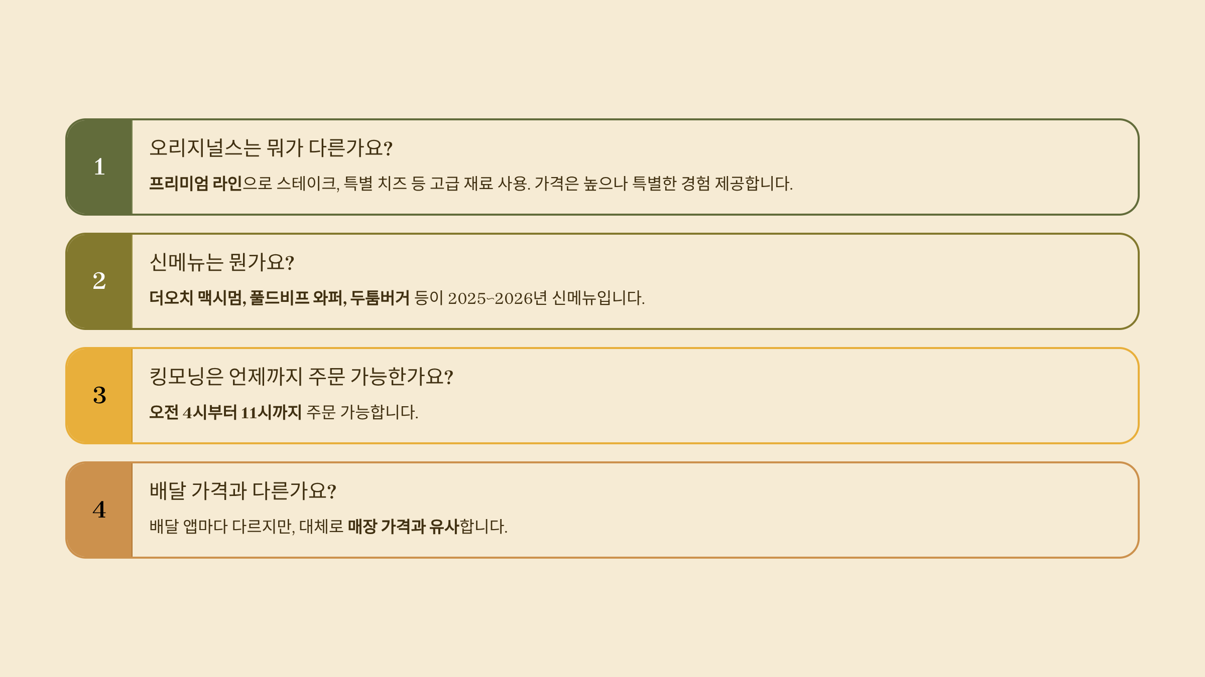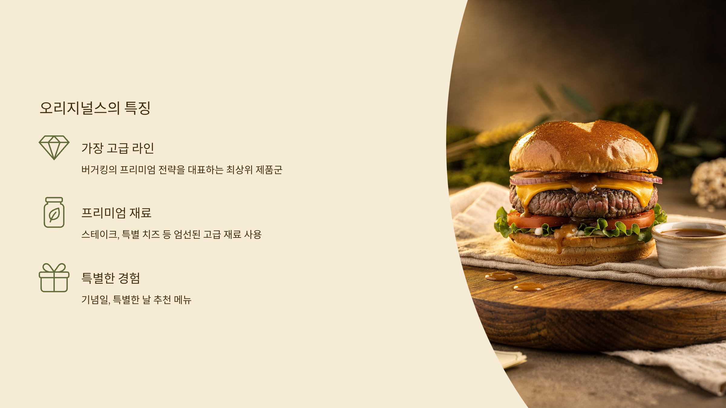 2025~2026년 버거킹은 "오리지널스" 프리미엄 라인 강화와 신메뉴 다양화로 브랜드를 업그레이드하고 있습니다. 풀드비프, 큐브스테이크, 치폴레 등 글로벌 트렌드 메뉴를 적극적으로 도입 중입니다.