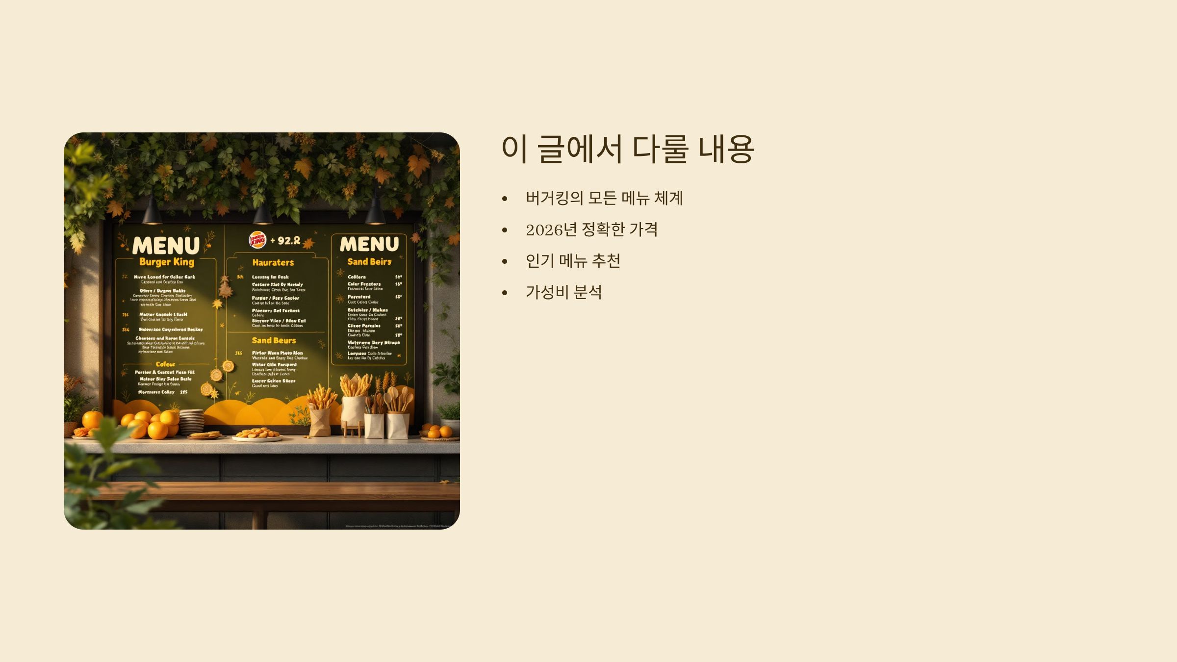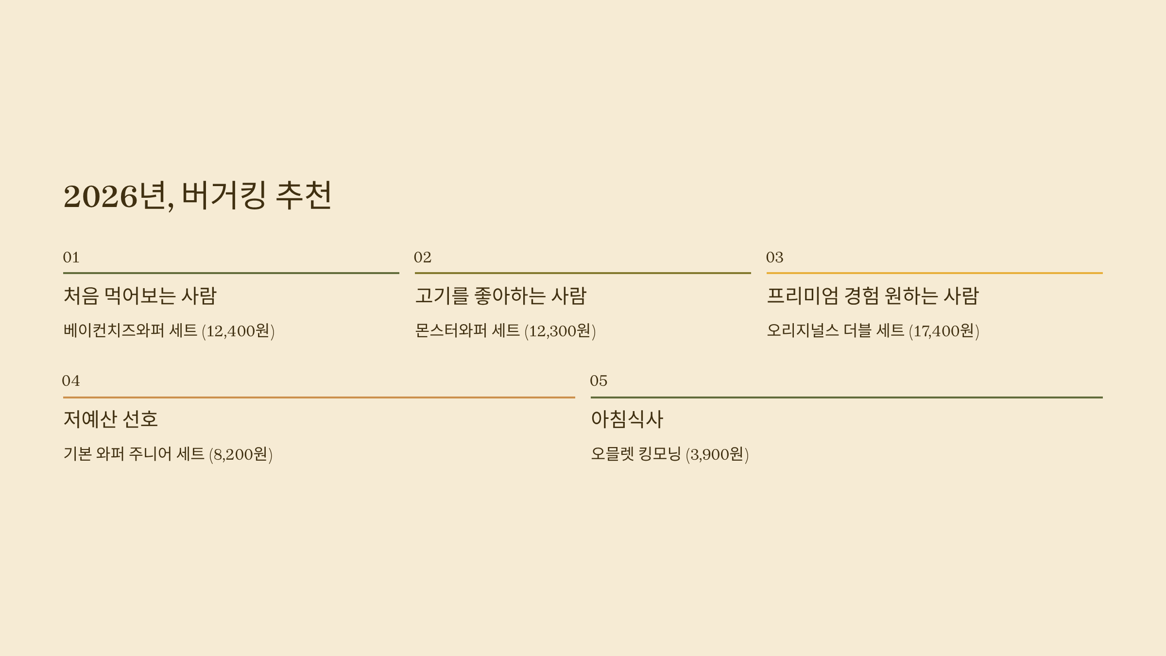 이 글에서는 버거킹의 모든 메뉴 체계, 2026년 정확한 가격, 인기 메뉴 추천, 가성비 분석을 상세히 정리해드리겠습니다.