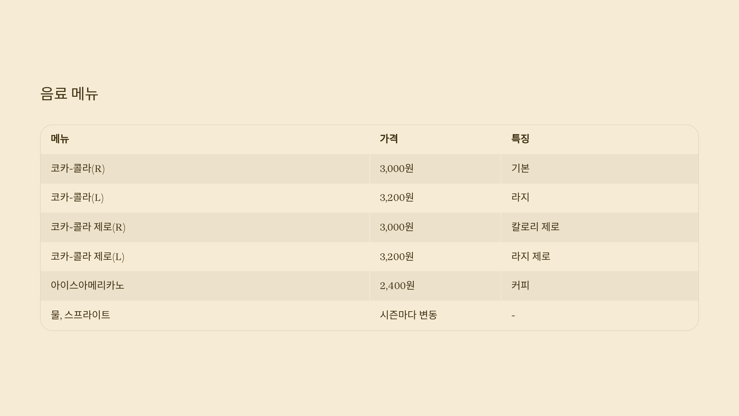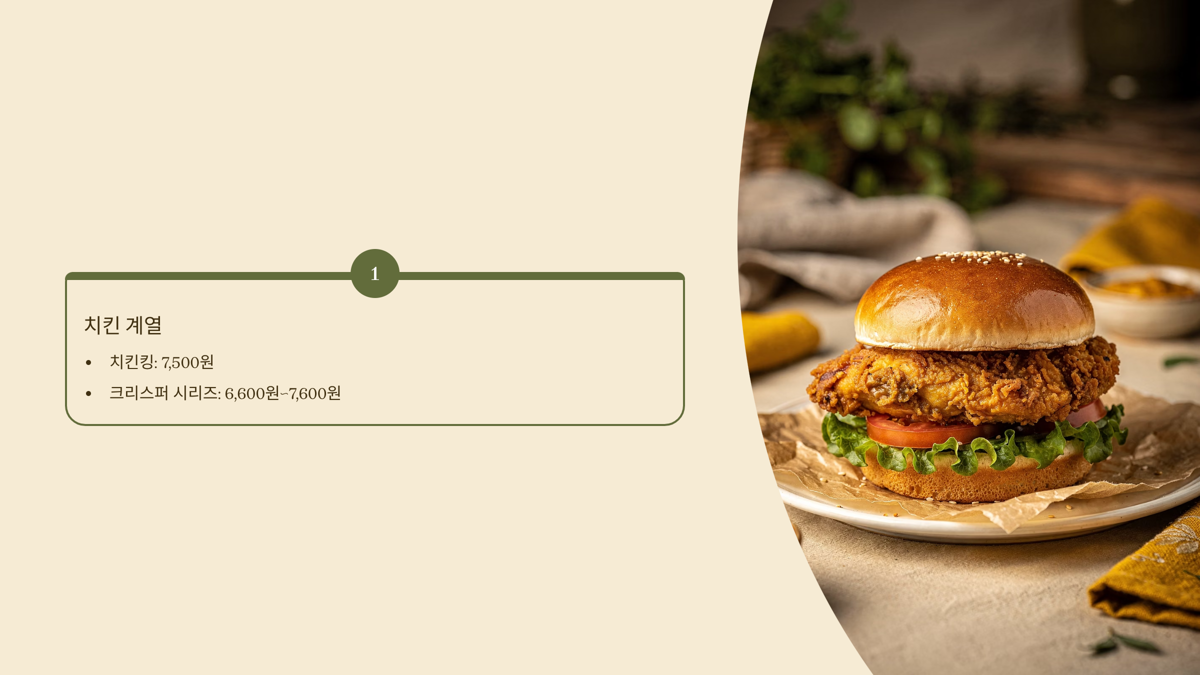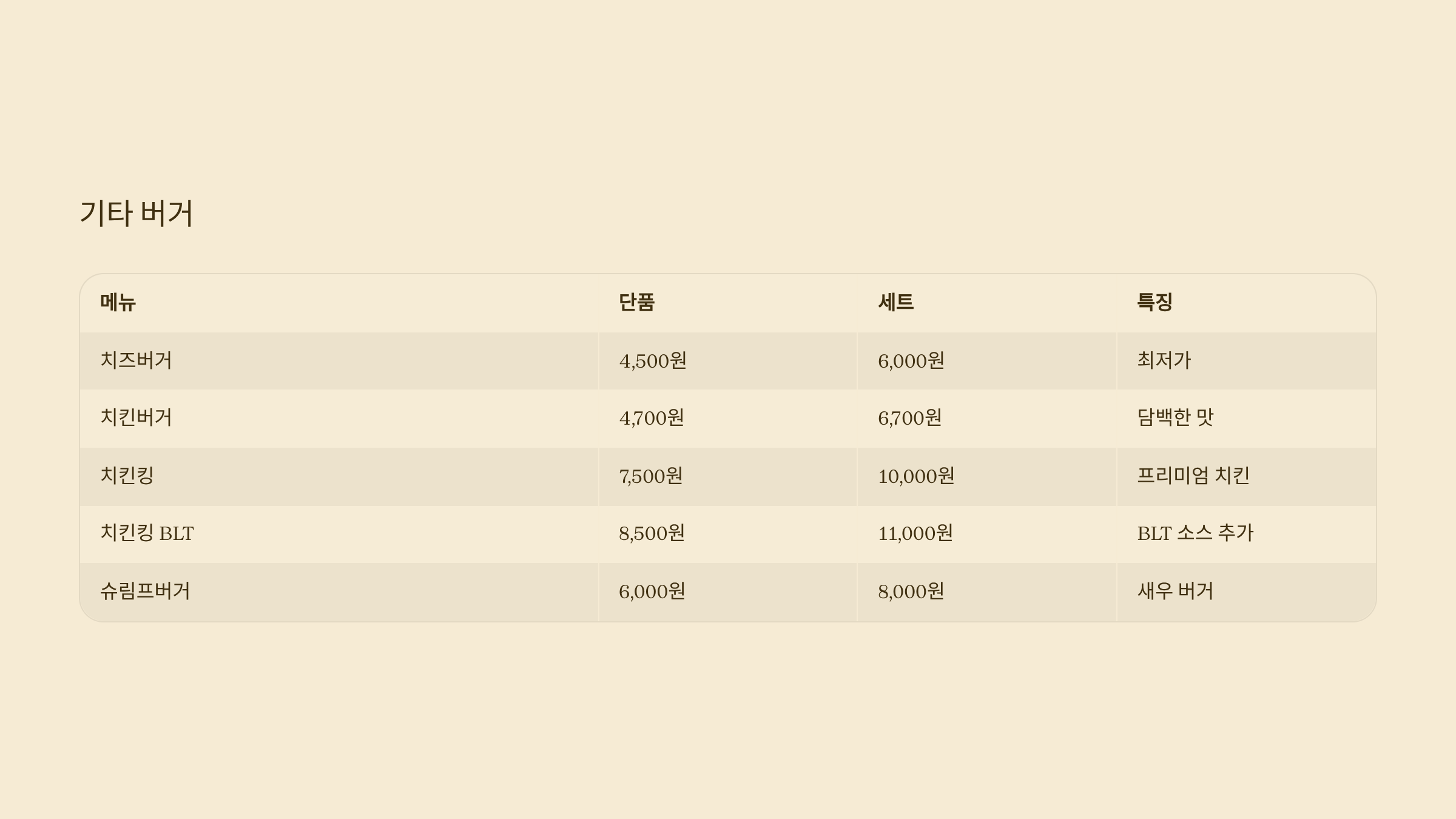 | 치킨버거 | 4,700원 | 6,700원 | 담백한 맛 |