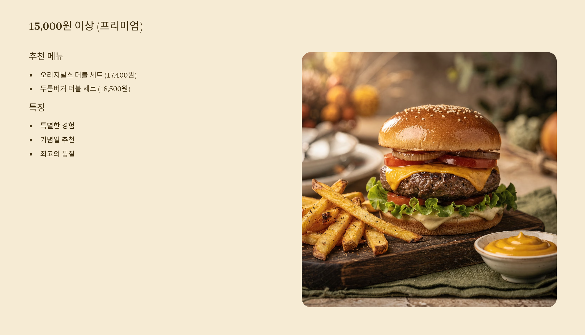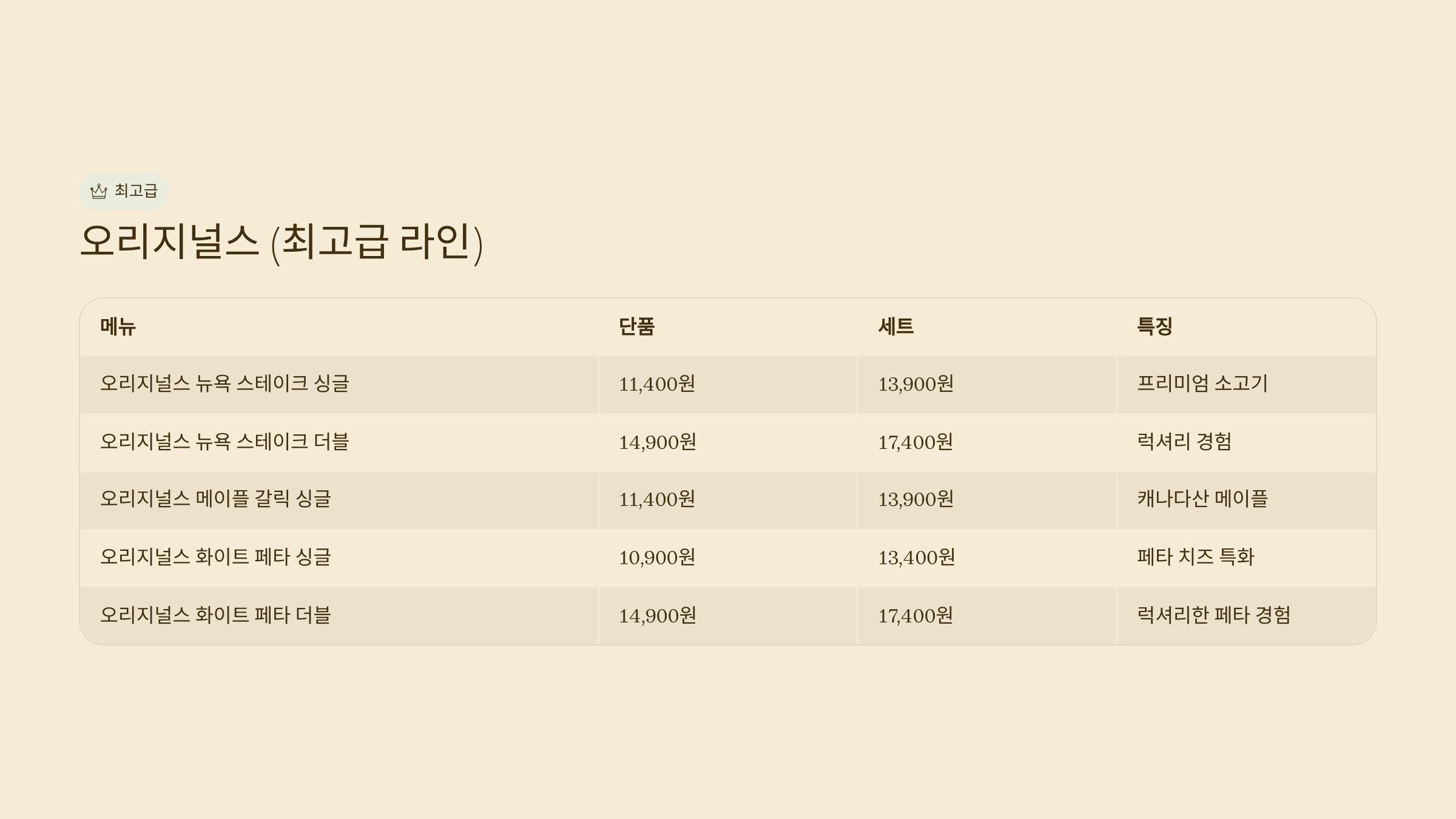 | 오리지널스 뉴욕 스테이크 더블 | 14,900원 | 17,400원 | 럭셔리 경험 |