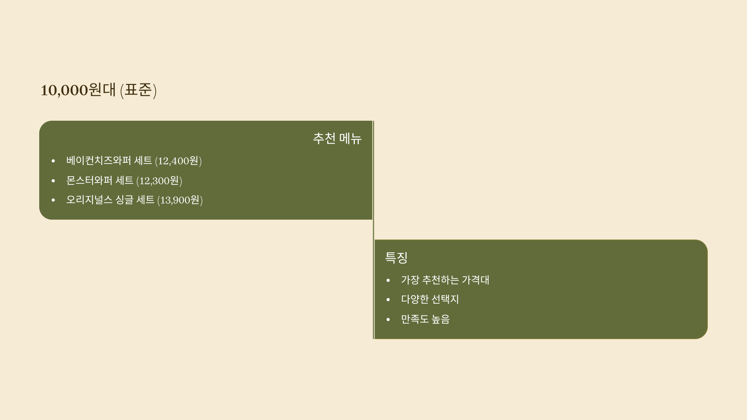 | 불맛 더블치즈버거 | 8,600원 | 10,600원 | 고급화 |