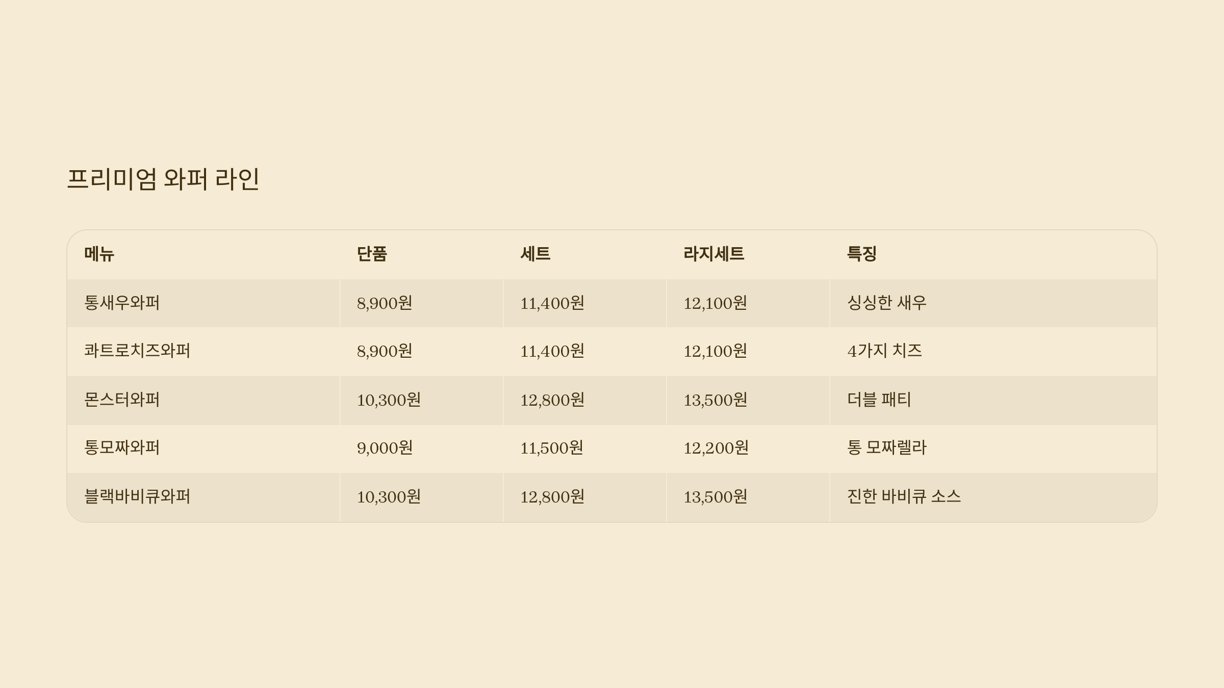 | 와퍼 | 8,100원 | 10,600원 | 11,300원 | 기본, 직화구이 |