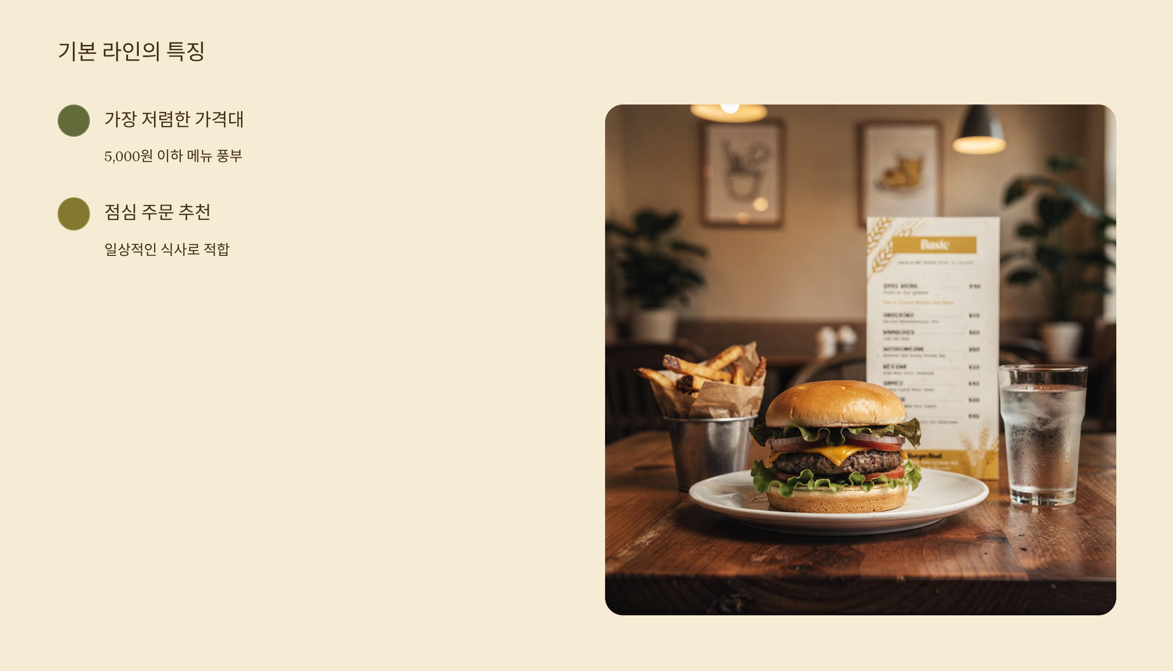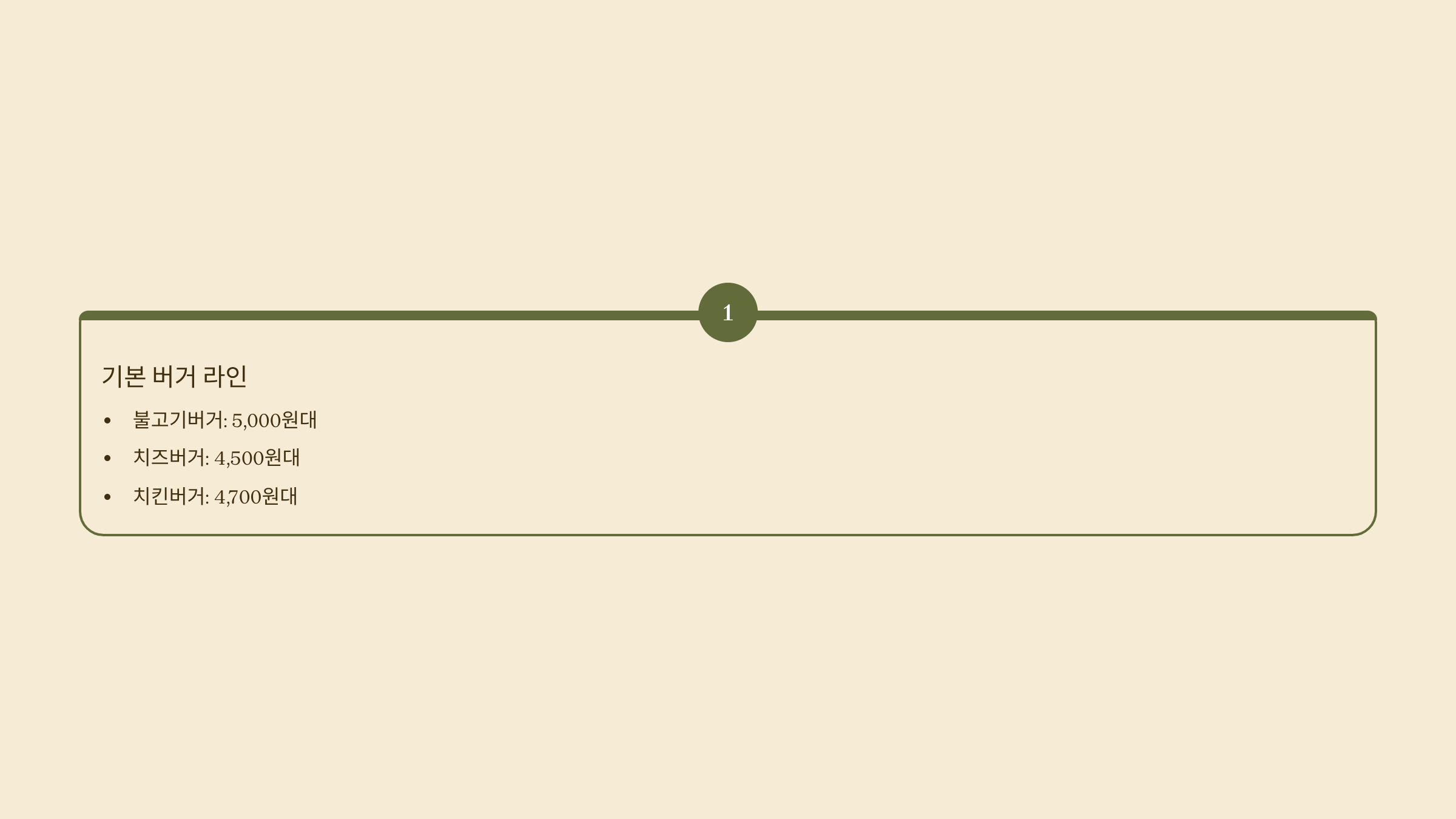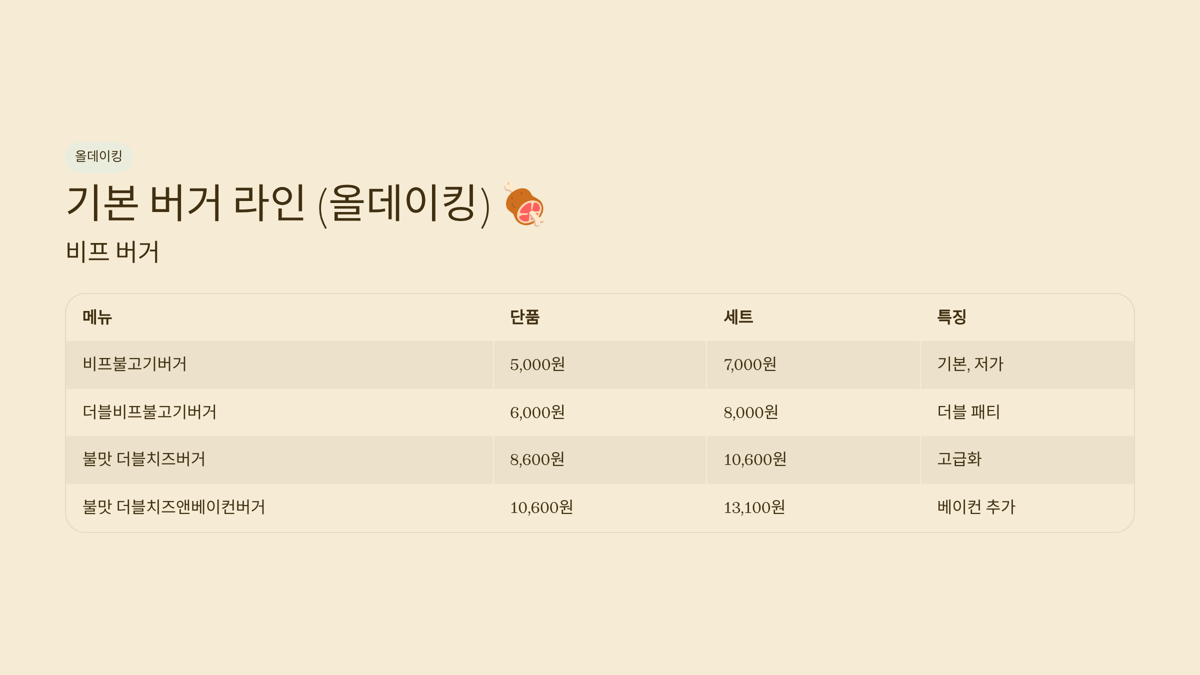 | 비프불고기버거 | 5,000원 | 7,000원 | 기본, 저가 |
