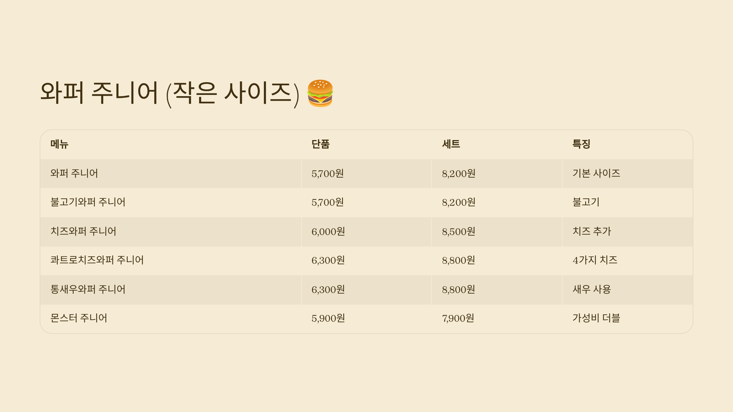 | 와퍼 주니어 | 5,700원 | 8,200원 | 기본 사이즈 |