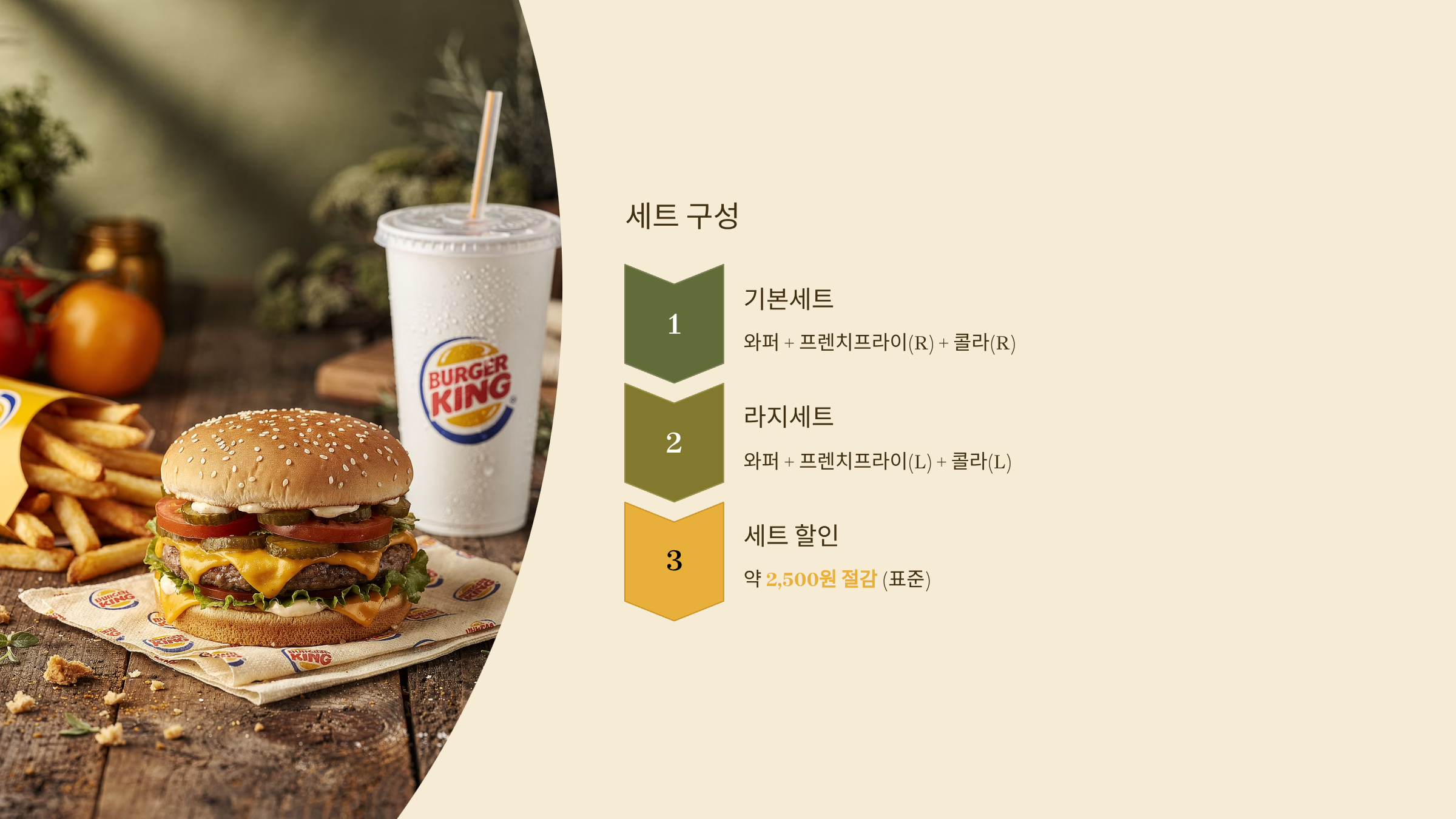- 기본세트: 와퍼 + 프렌치프라이(R) + 콜라(R)