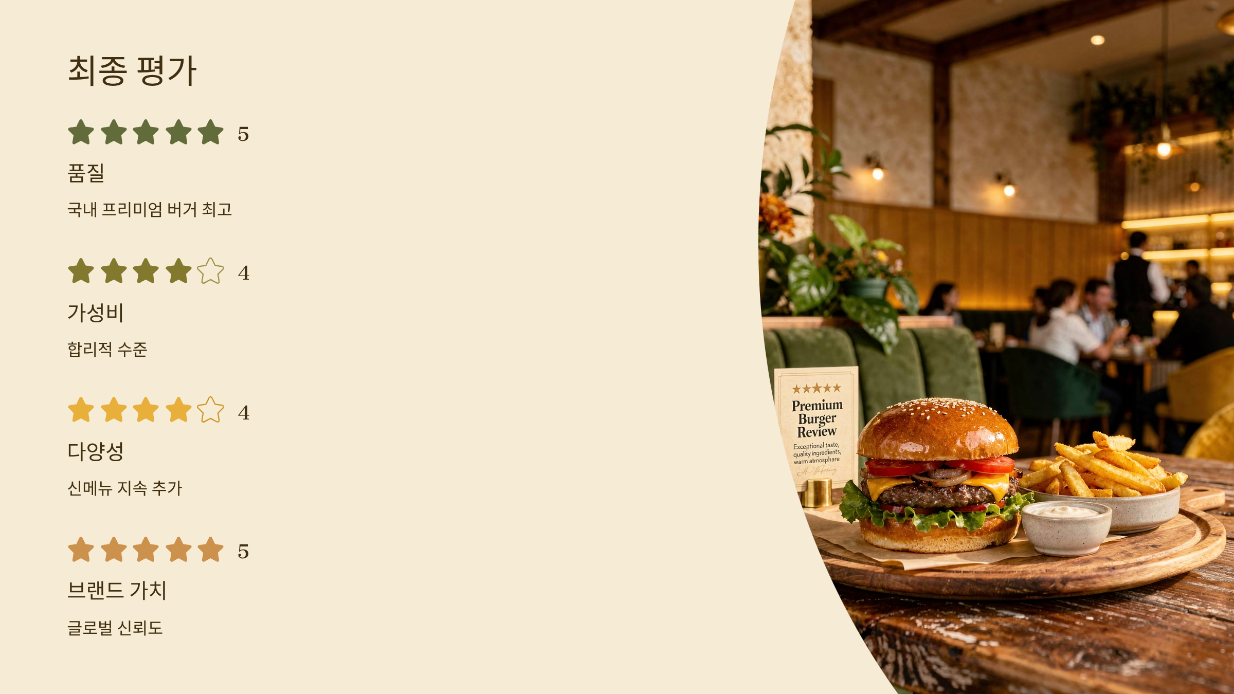 - 품질: ⭐⭐⭐⭐⭐ (국내 프리미엄 버거 최고)