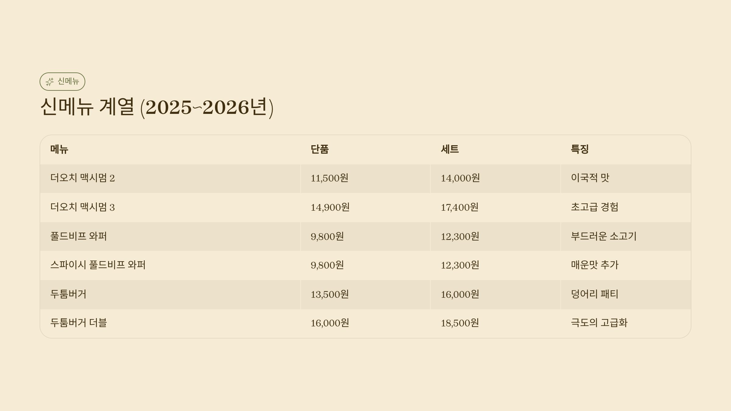 A. 더오치 맥시멈, 풀드비프 와퍼, 두툼버거 등이 2025~2026년 신메뉴입니다.