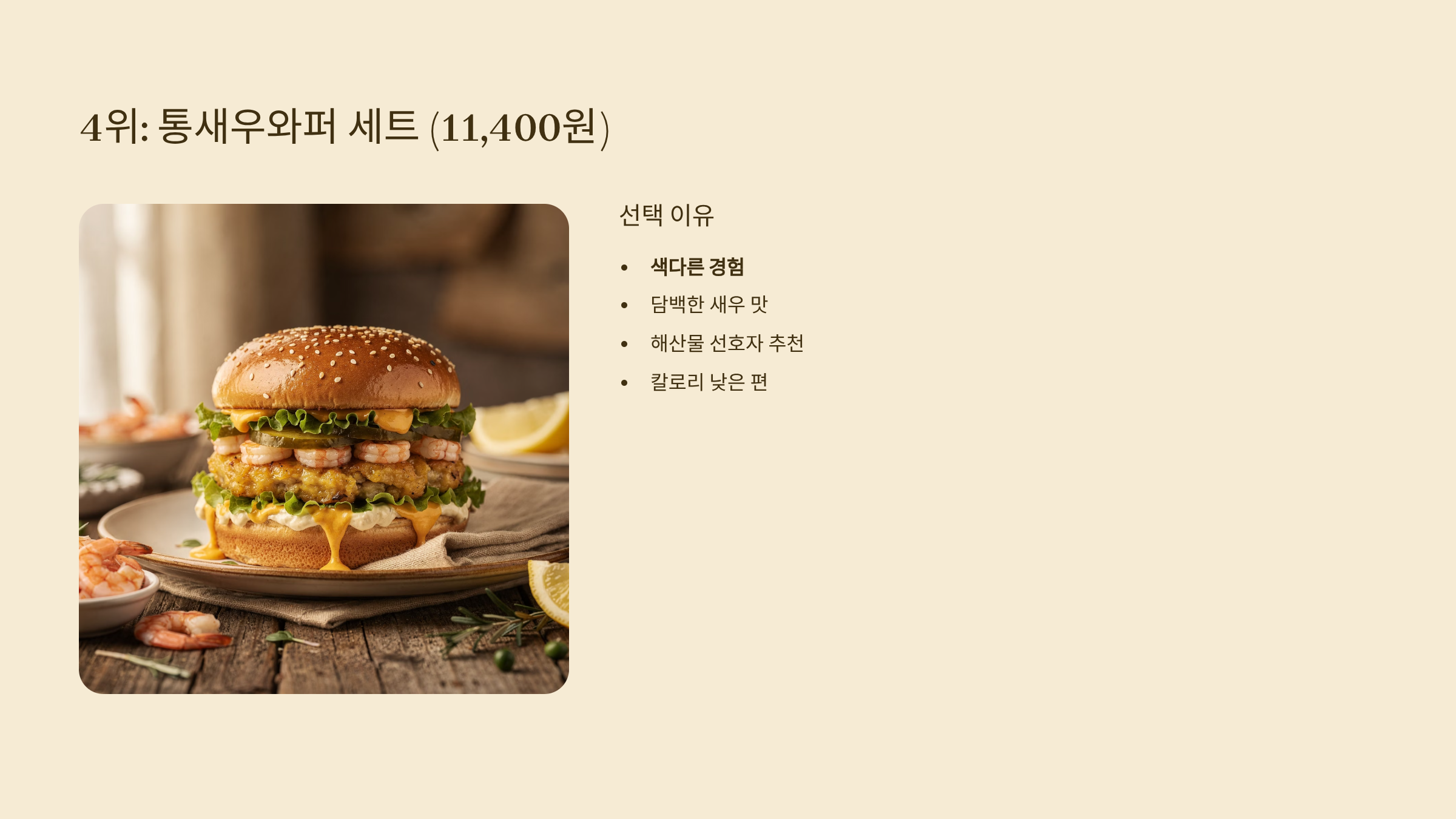 | 통새우와퍼 | 8,900원 | 11,400원 | 12,100원 | 싱싱한 새우 |