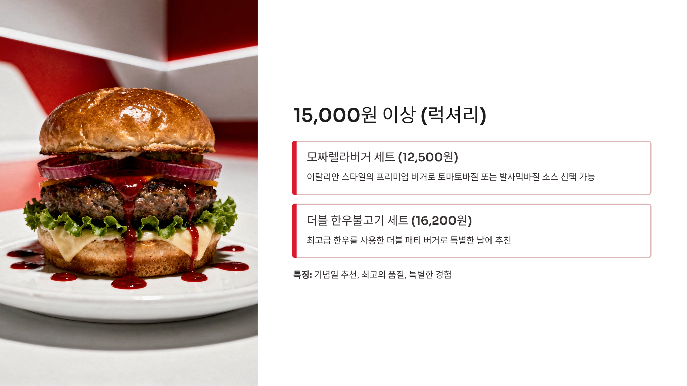 | 더블 한우불고기버거 | 13,800원 | 16,200원 | 럭셔리 경험 |