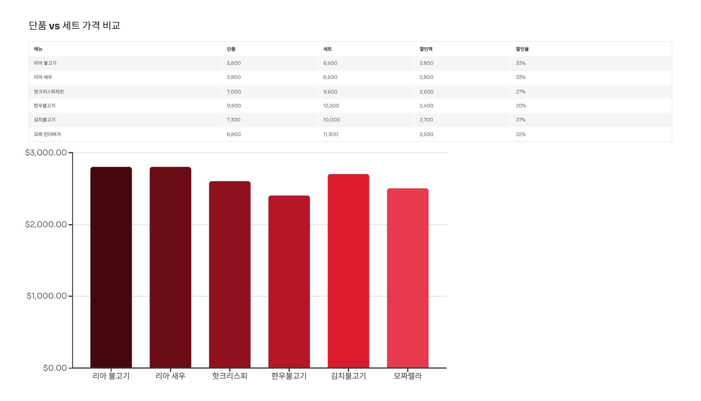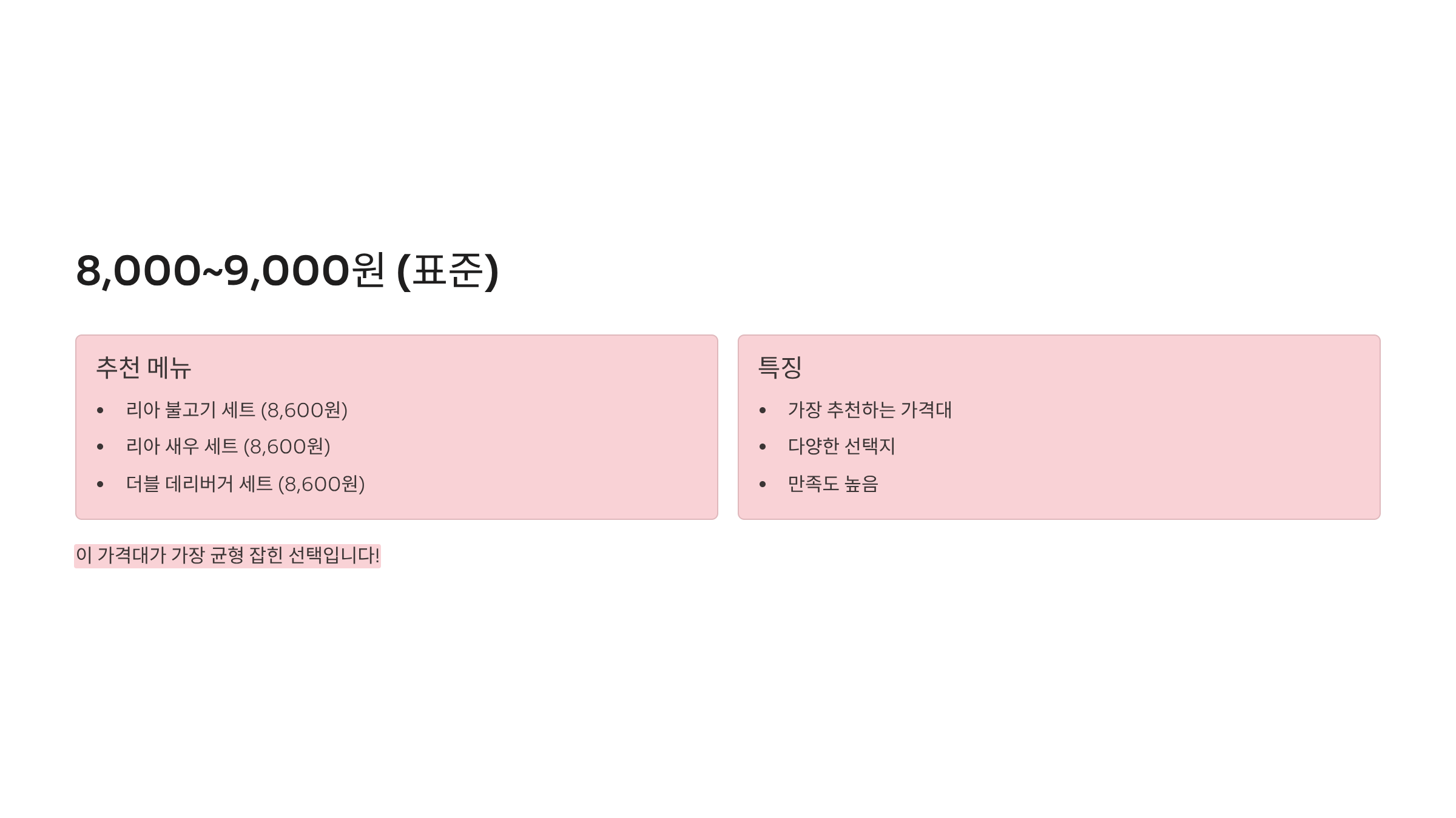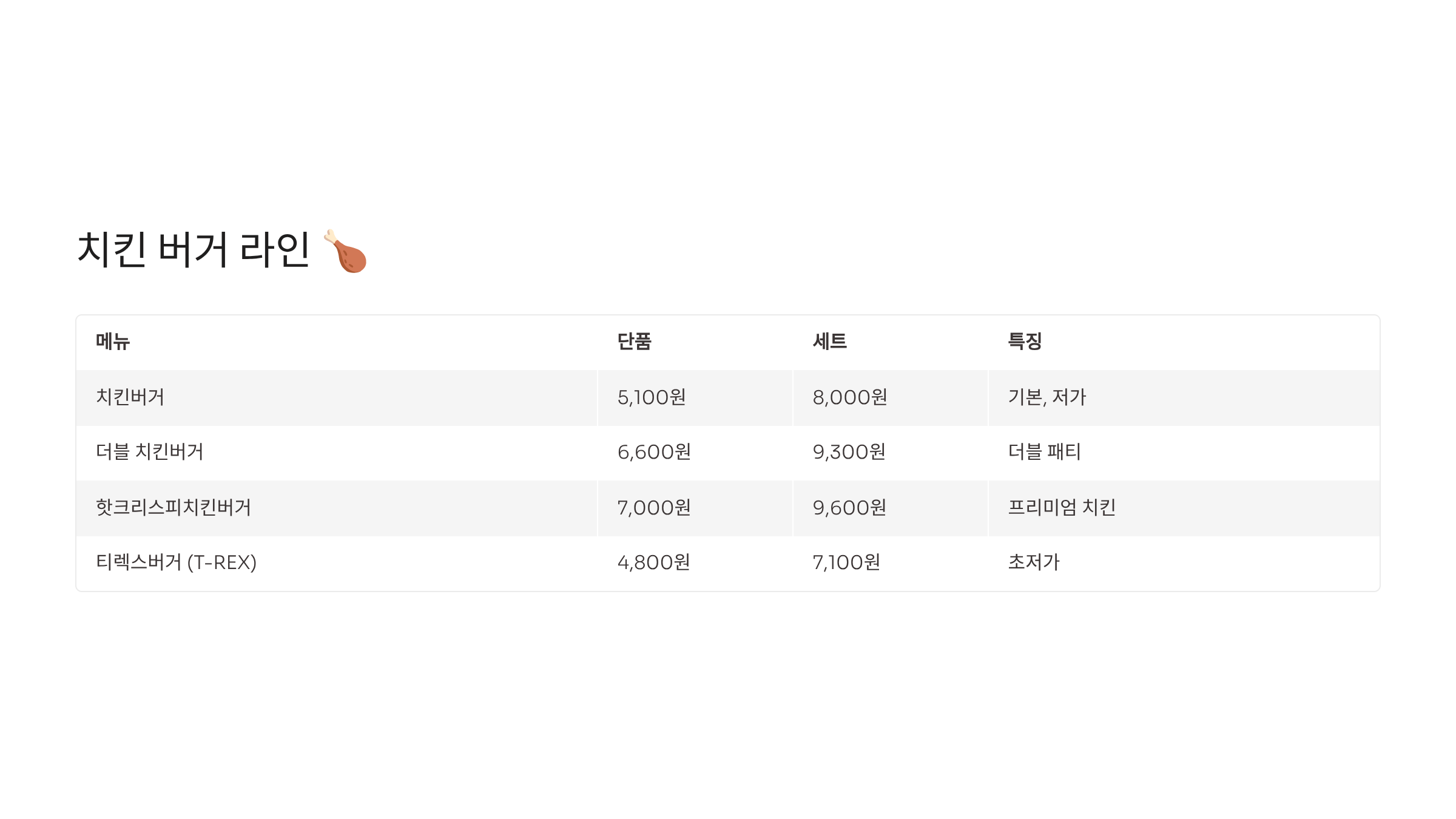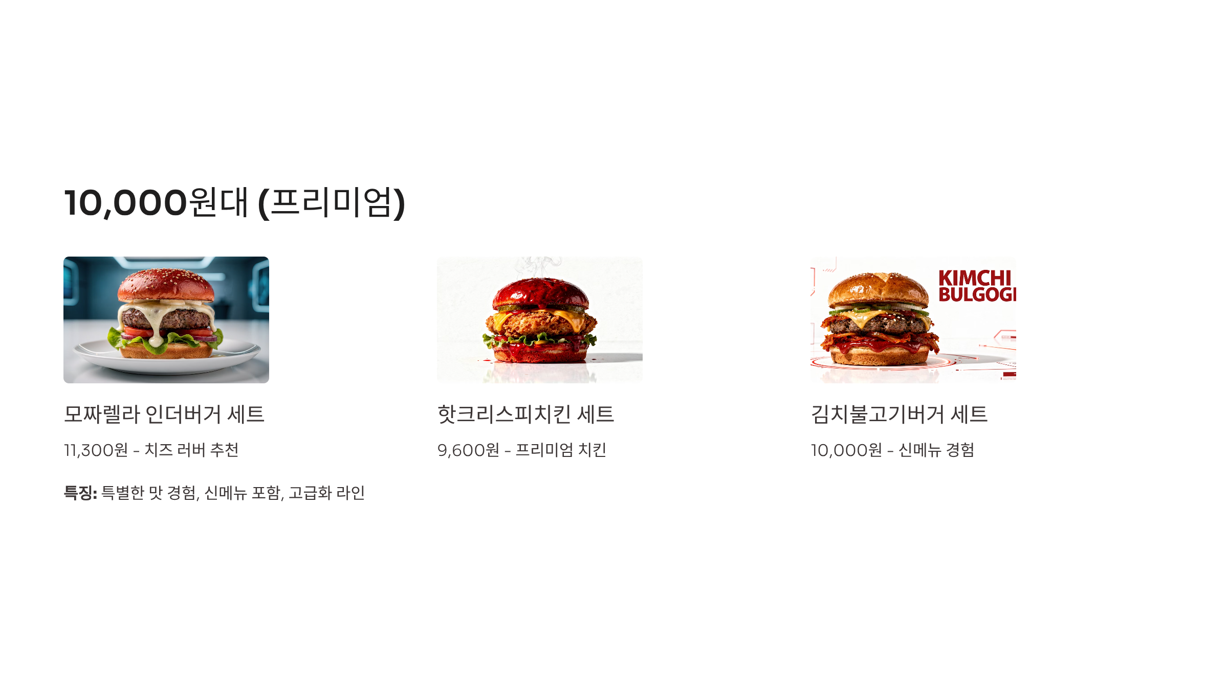 | 치킨버거 | 5,100원 | 8,000원 | 기본, 저가 |