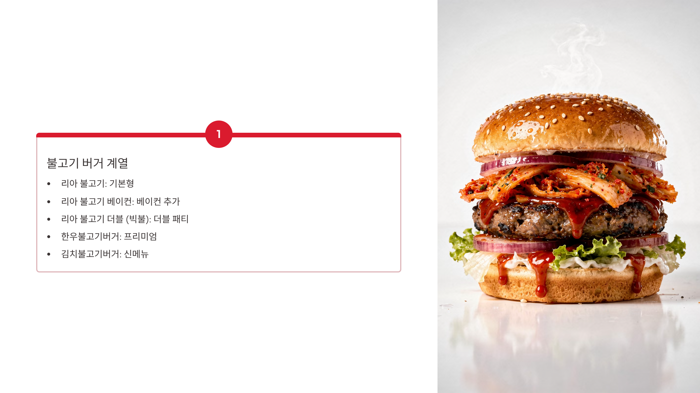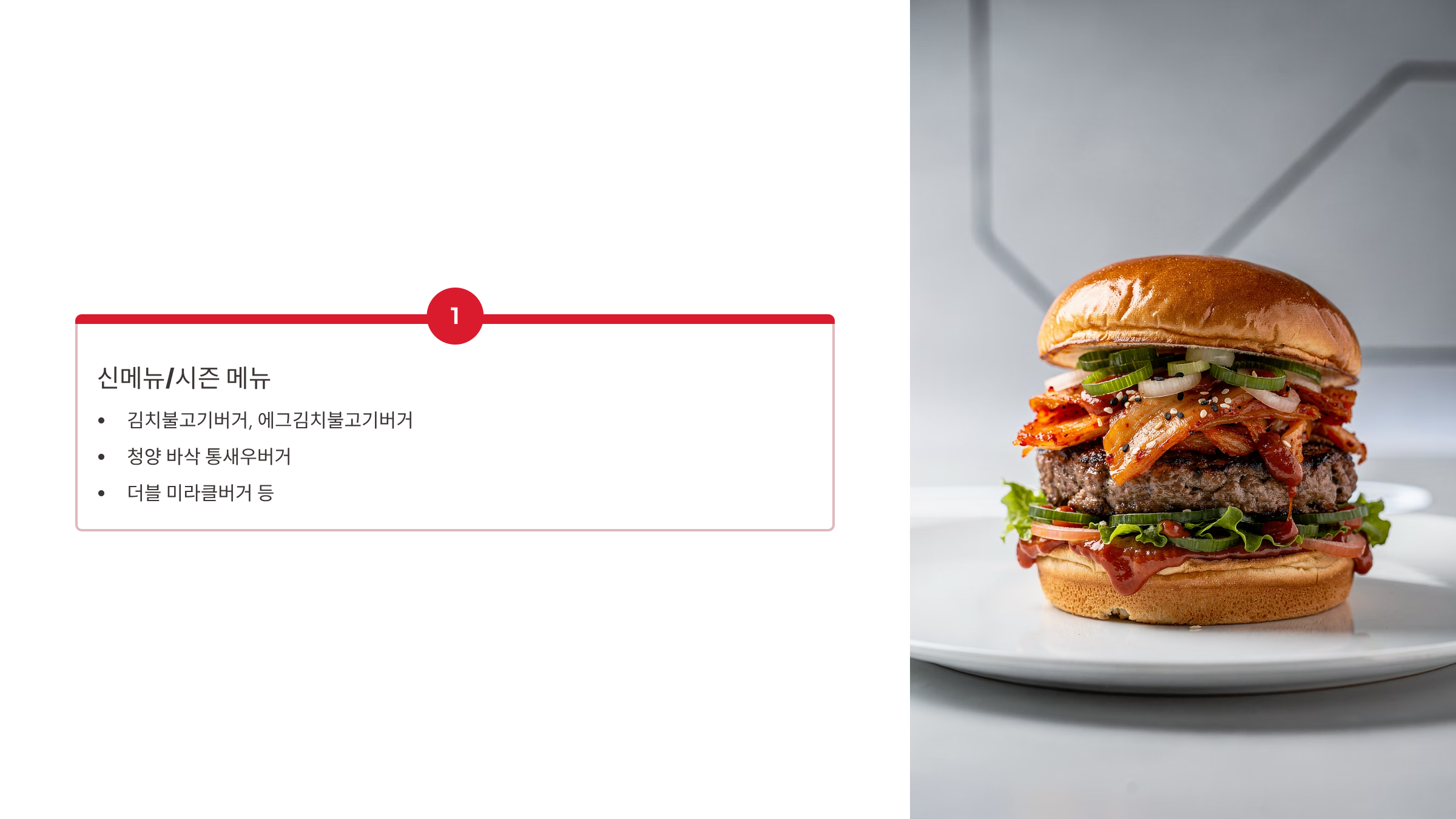- 김치불고기버거 (2025년 7월): 국내산 김치 + 깍두기