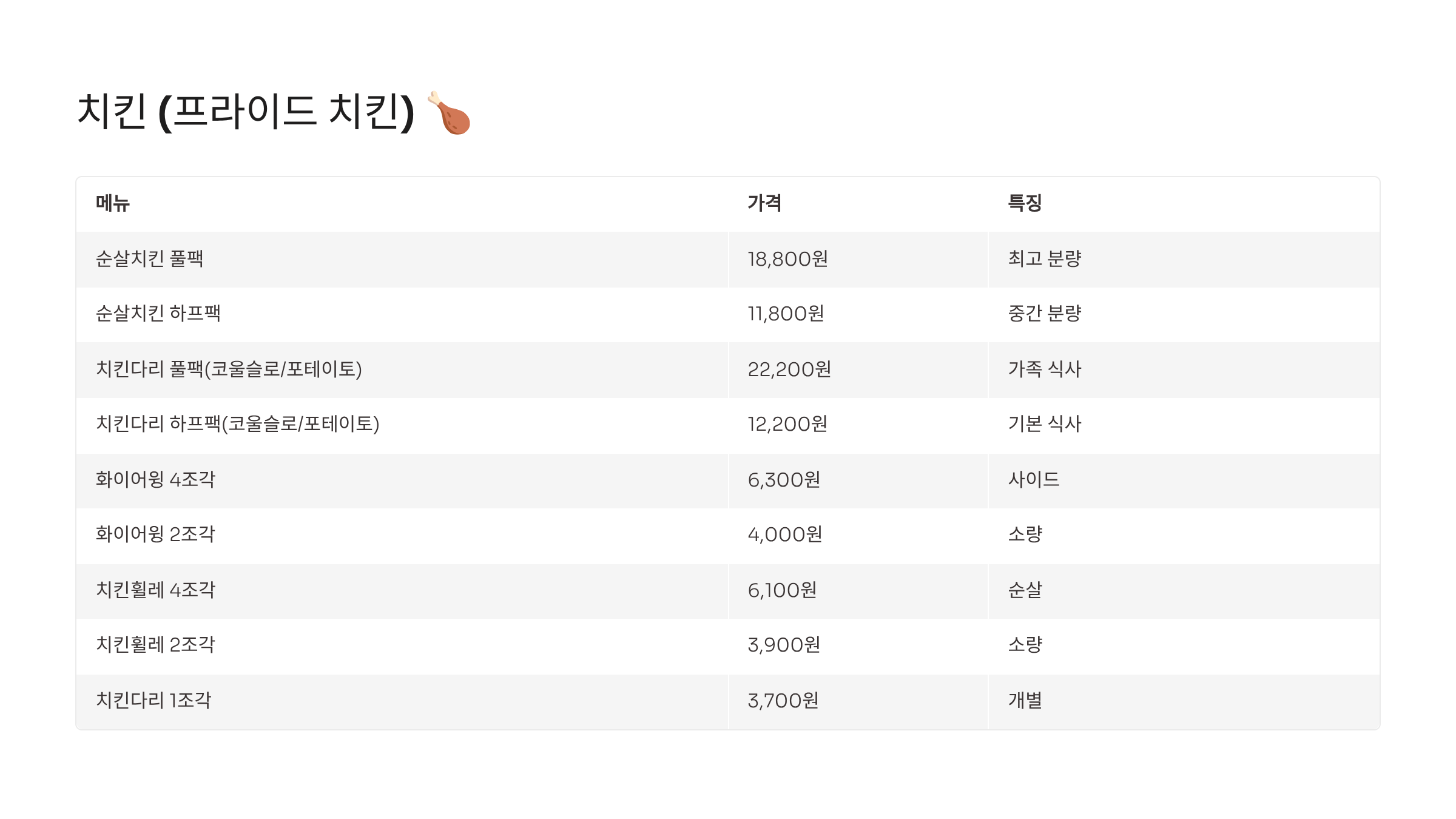 | 치킨 싱글팩 | 5,400원 | 새로 추가, 저가 |