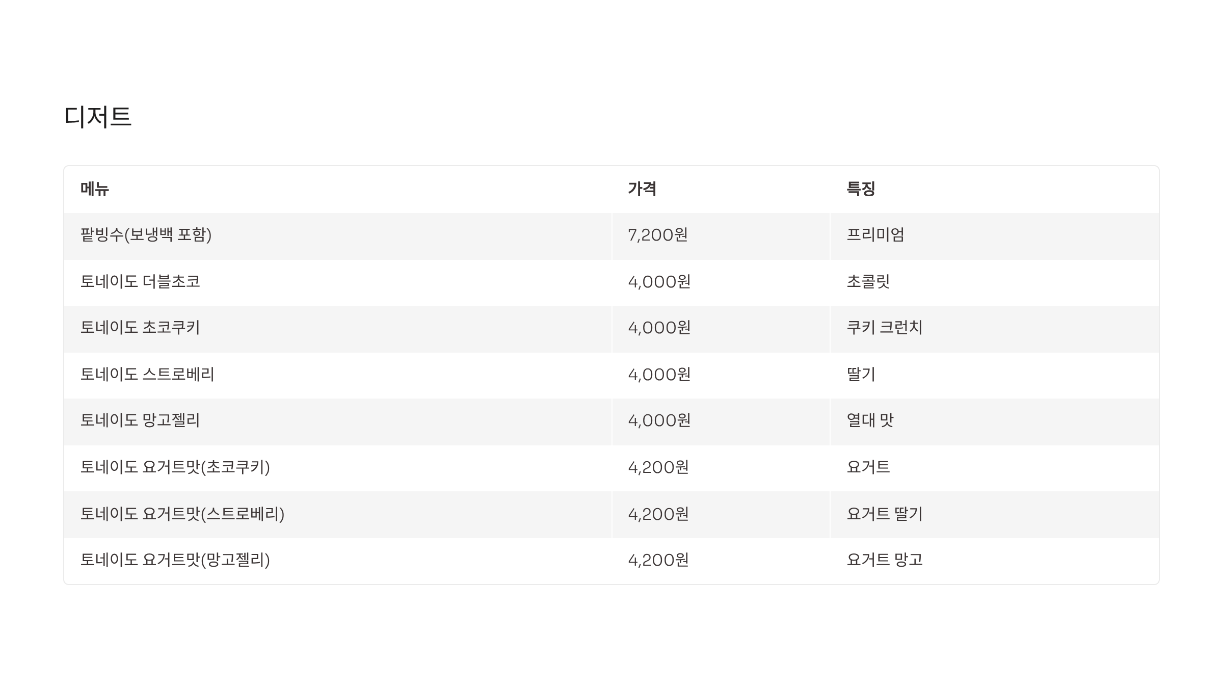 - 디저트: 토네이도, 팥빙수 등