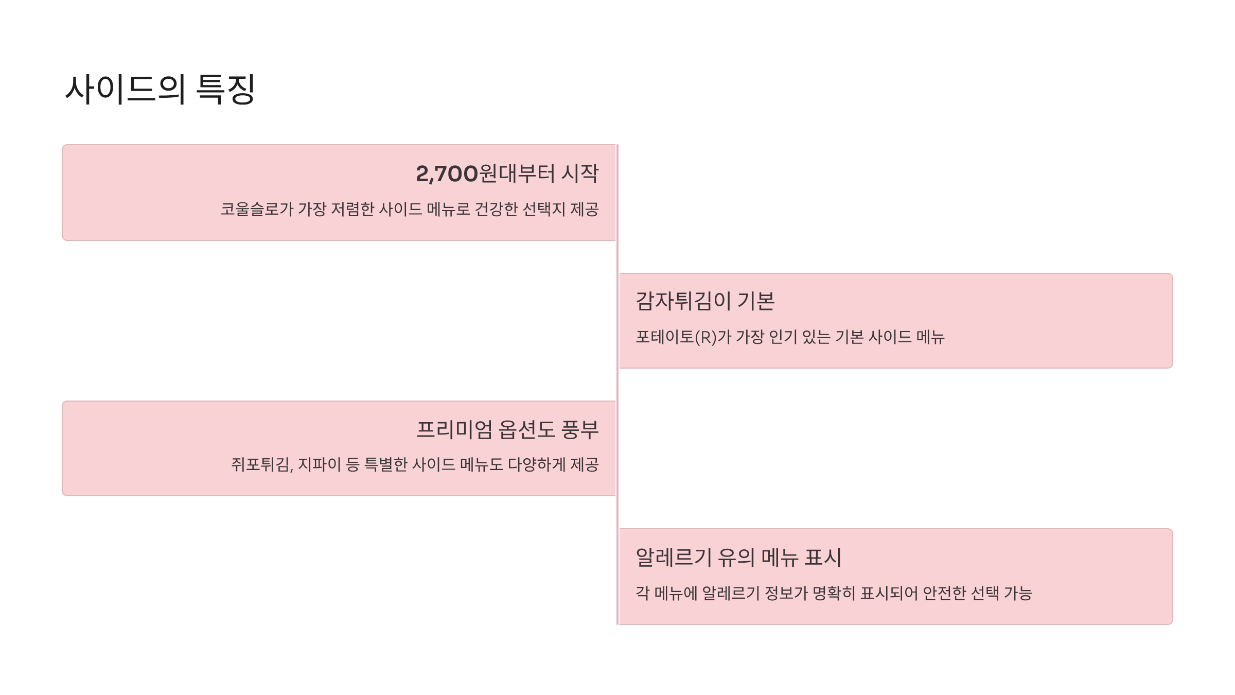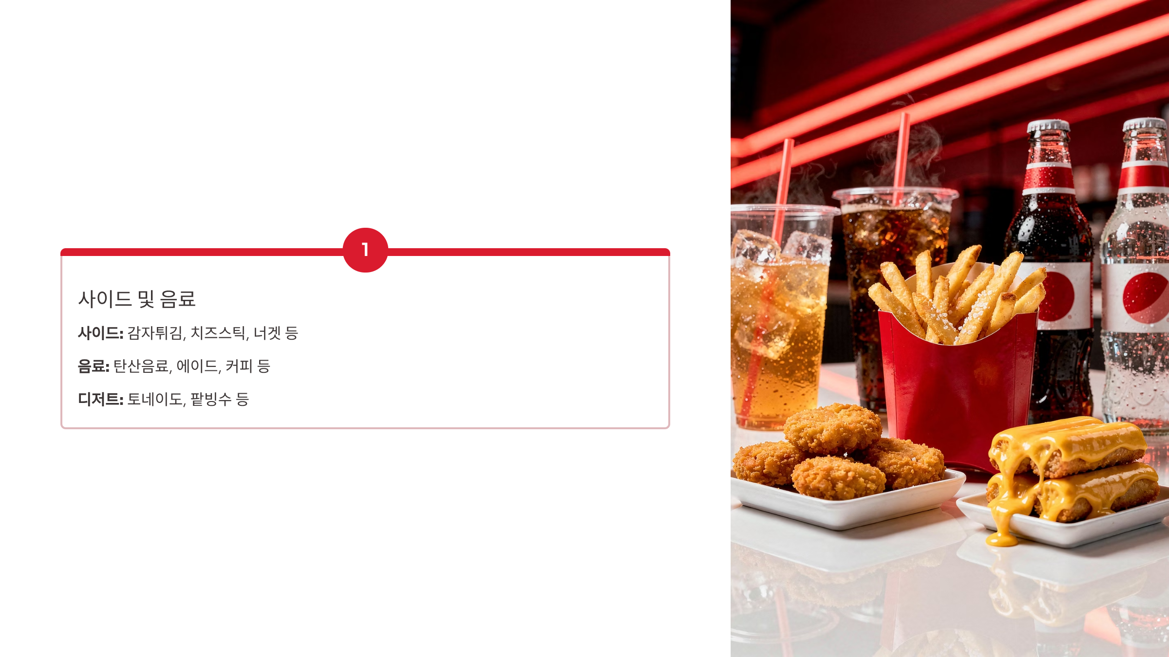 - 사이드: 감자튀김, 치즈스틱, 너겟 등