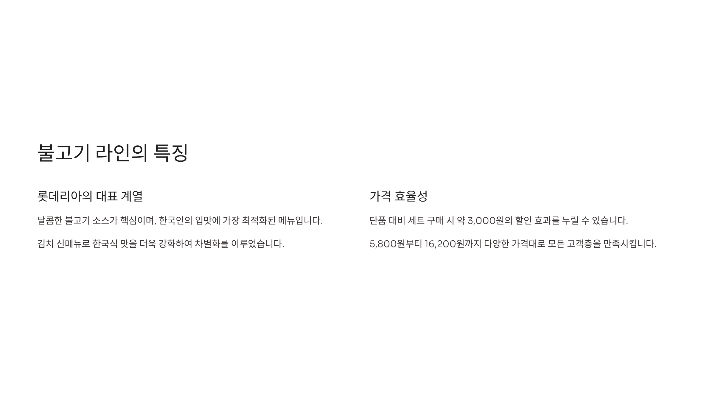 | 리아 불고기 | 5,800원 | 8,600원 | 기본, 가성비 |