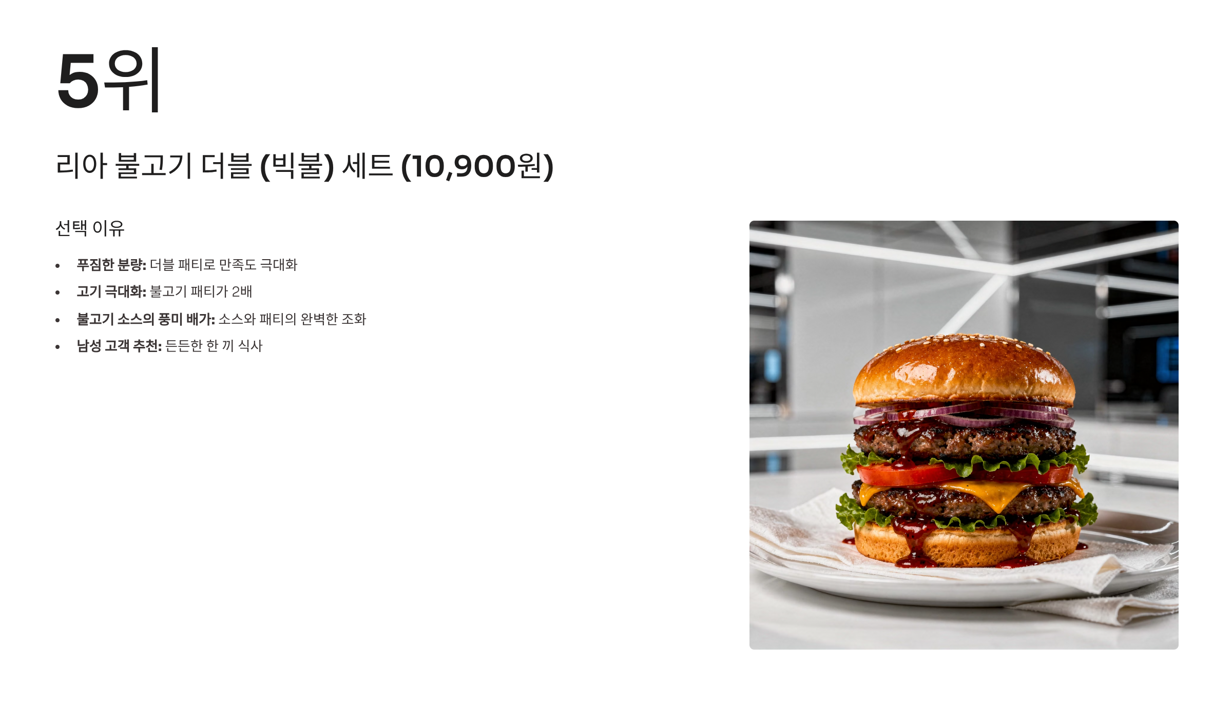 5위: 리아 불고기 더블 (빅불) 세트 (10,900원)