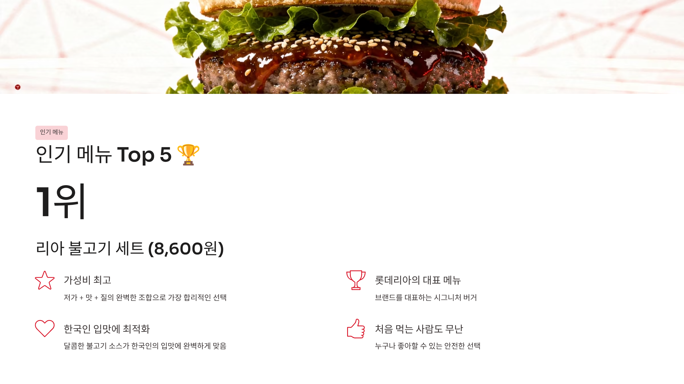 2024년부터 2026년까지 롯데리아는 한우버거, 모짜렐라 시리즈, 오징어 버거, 김치 버거 등 한국인의 입맛에 맞춘 특화 메뉴를 지속적으로 출시하고 있습니다. 특히 "리아 런치" 개편으로 5,400원부터 시작하는 저가 세트를 강화했습니다.