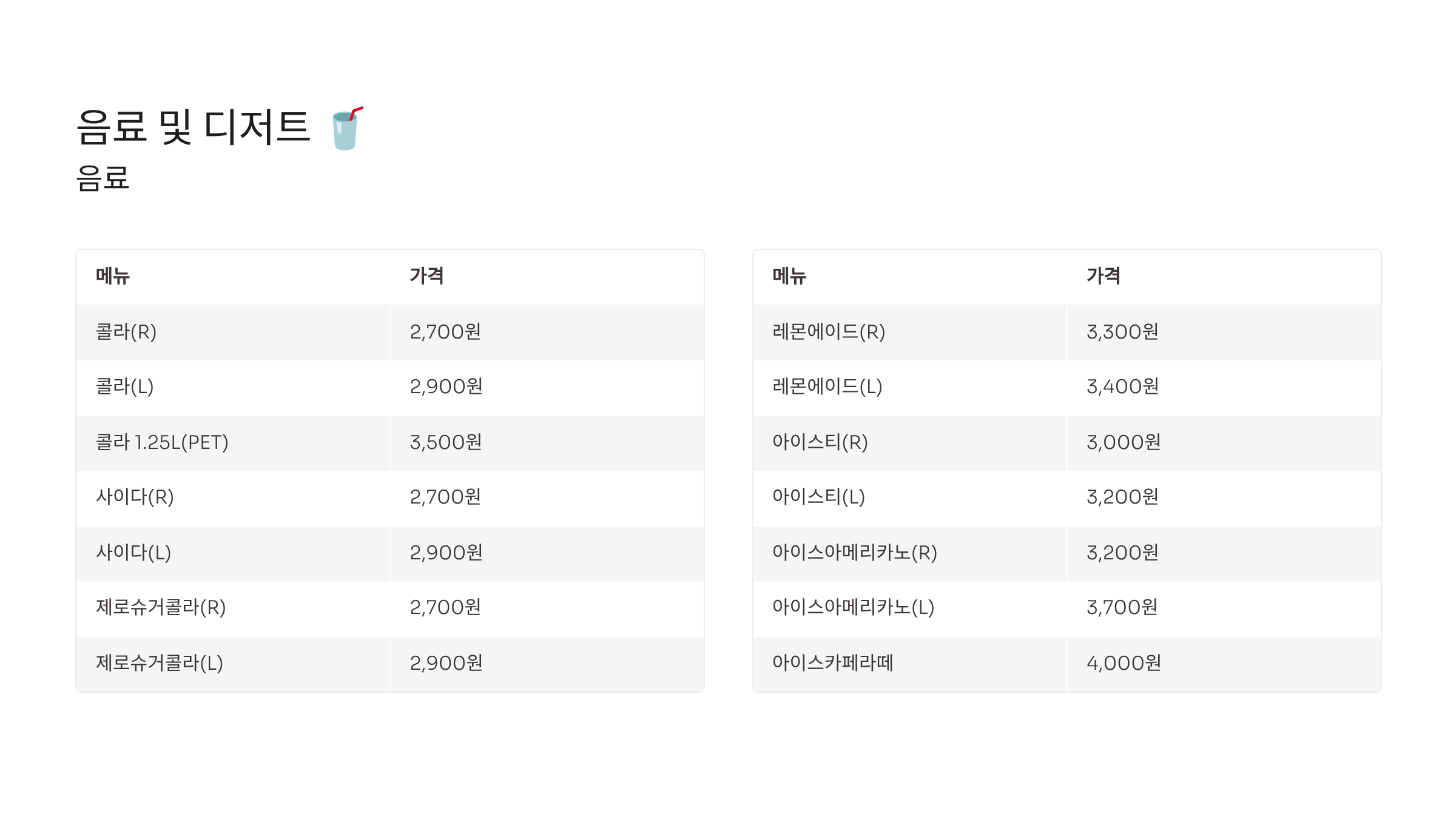 - 음료: 탄산음료, 에이드, 커피 등